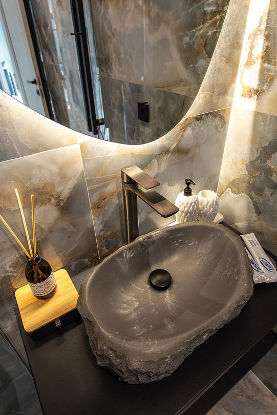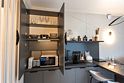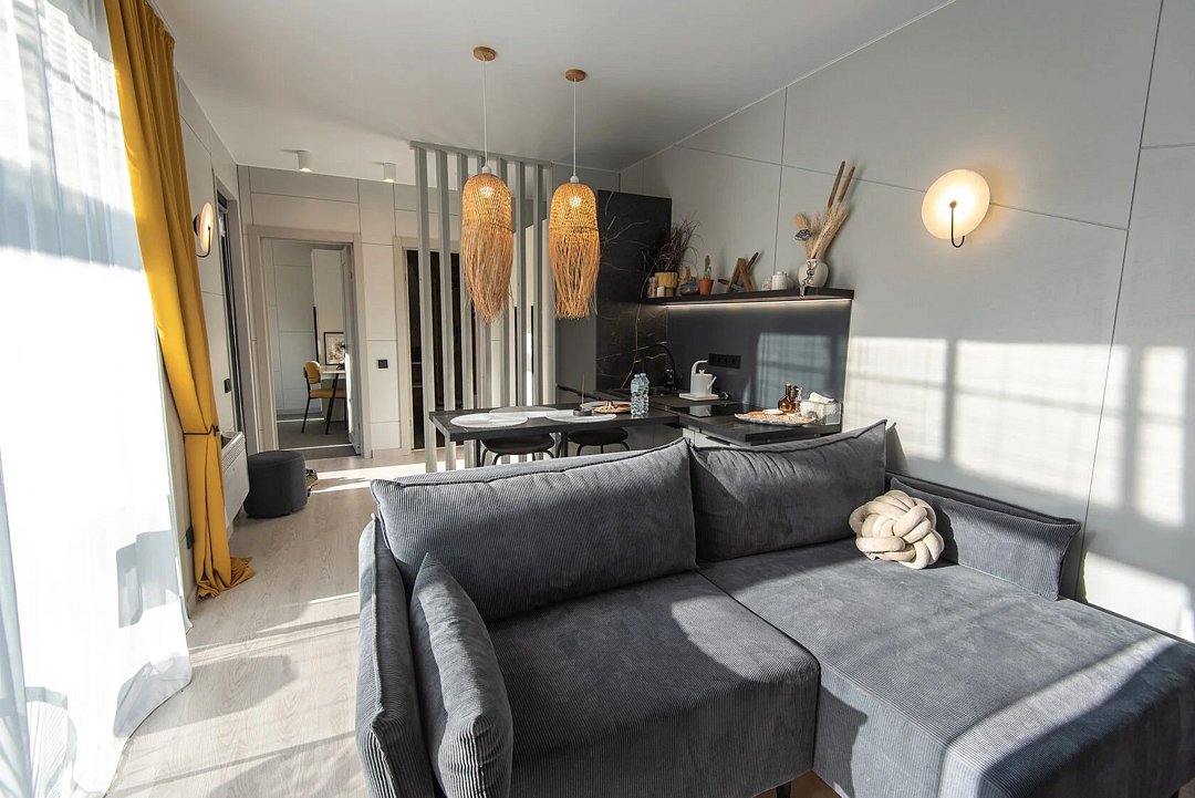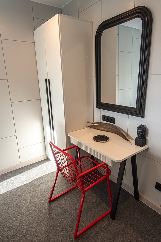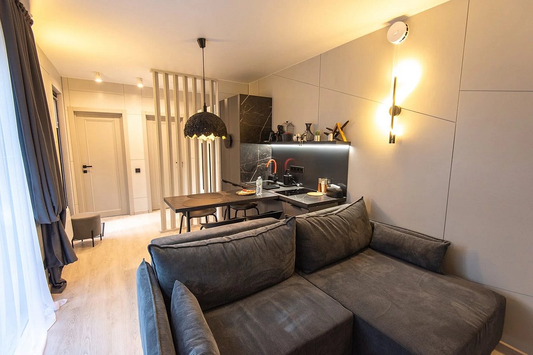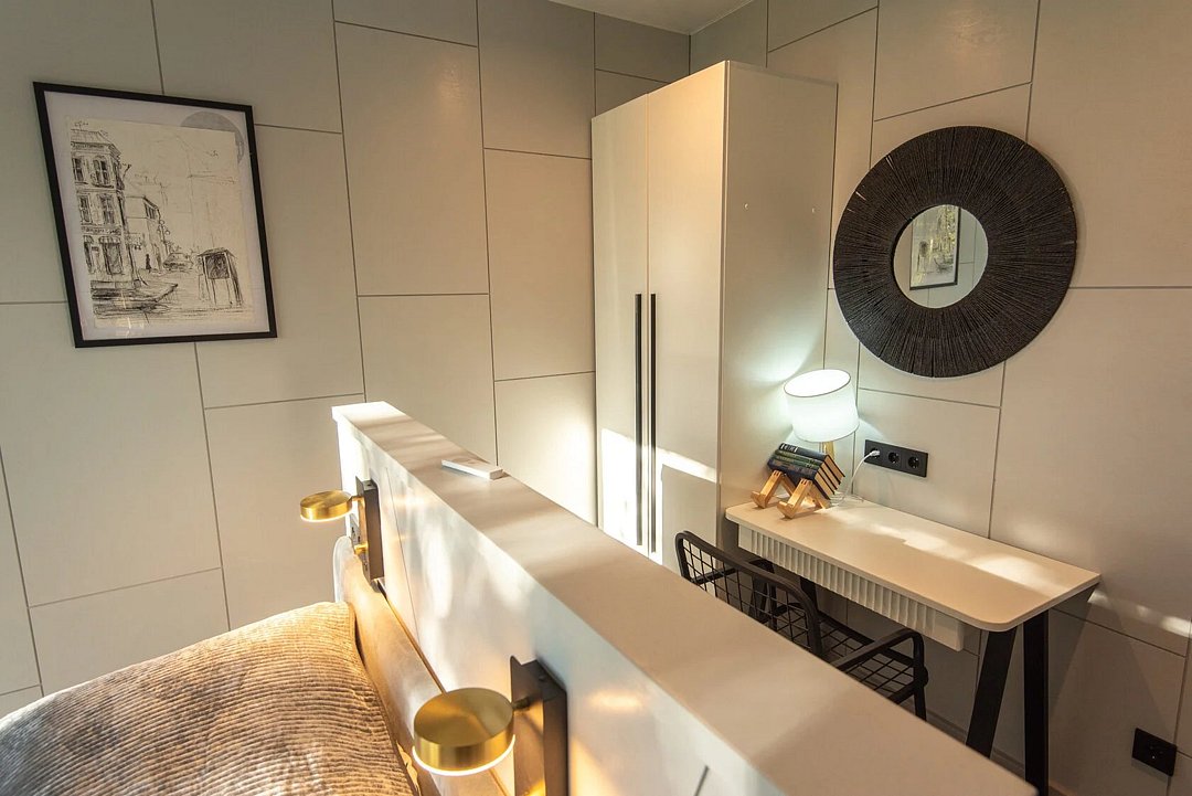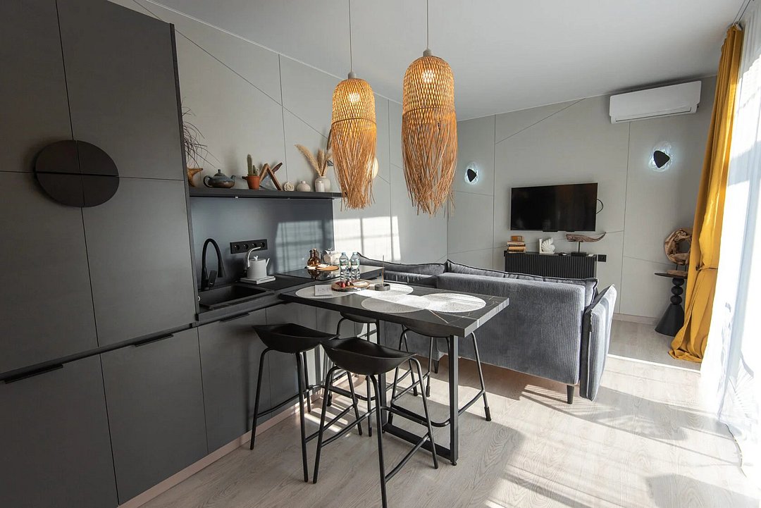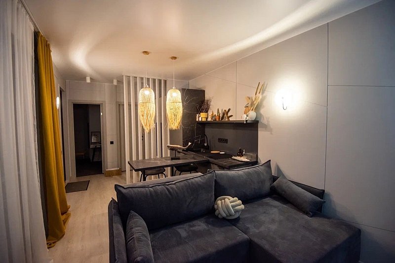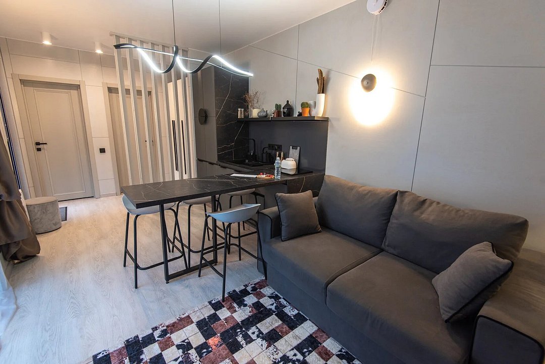 Авторский дизайн интерьеров. Оборудованная всей необходимой техникой мини-кухня (плита, СВЧ печь, чайник, холодильник, тостер, капсульная кофемашина), полный комплект посуды, постельное белье, полотенца, халаты, тапочки, панорамные окна.