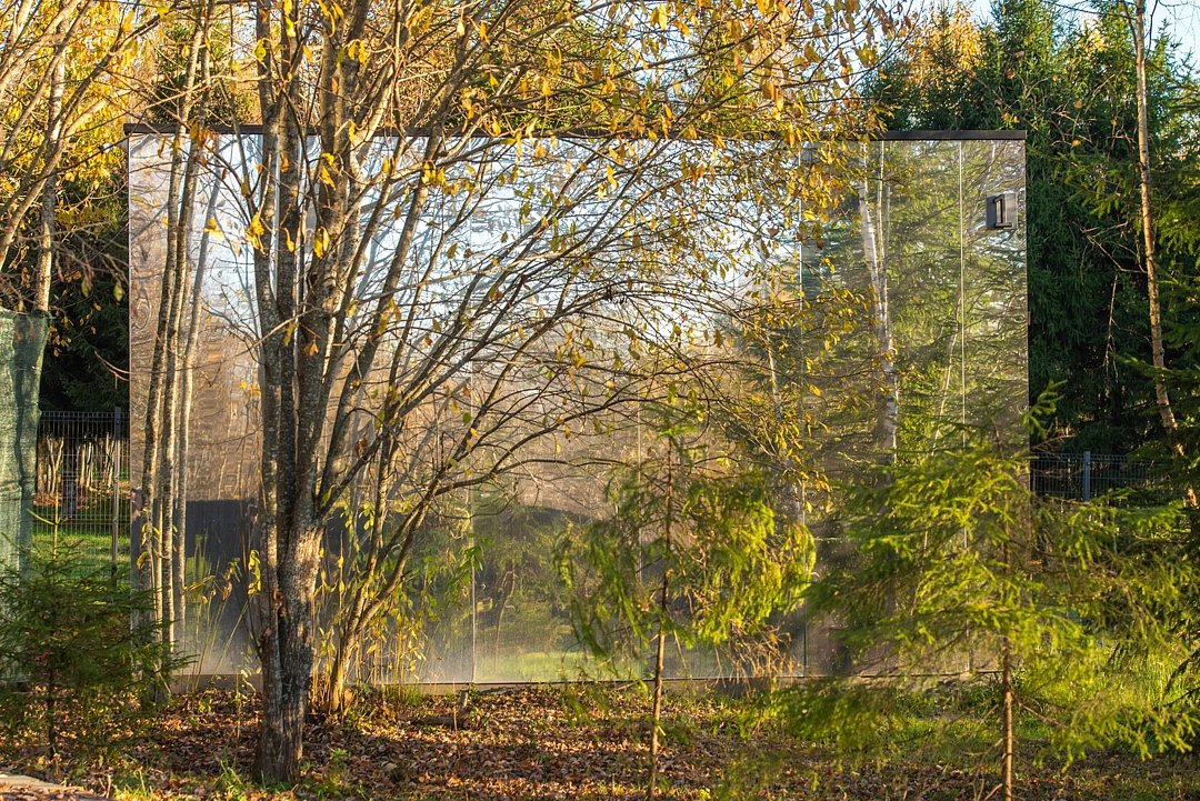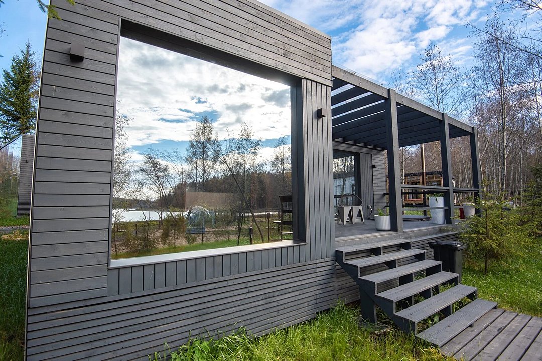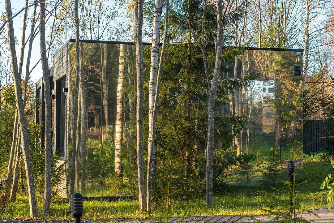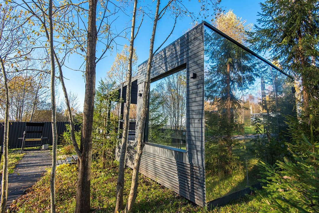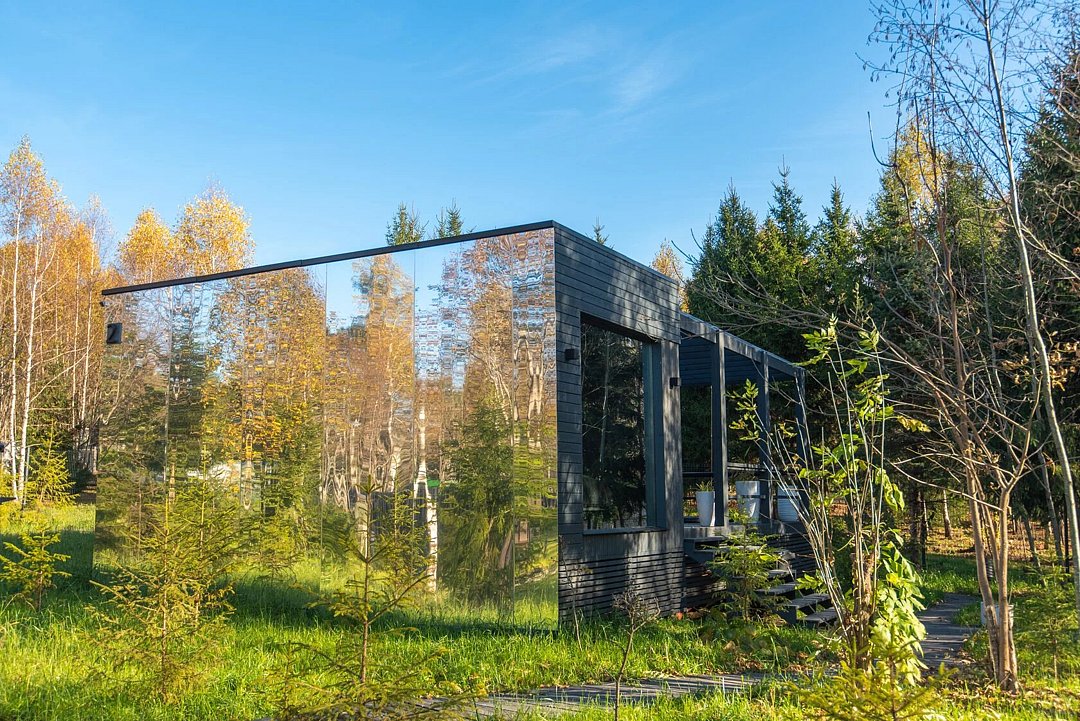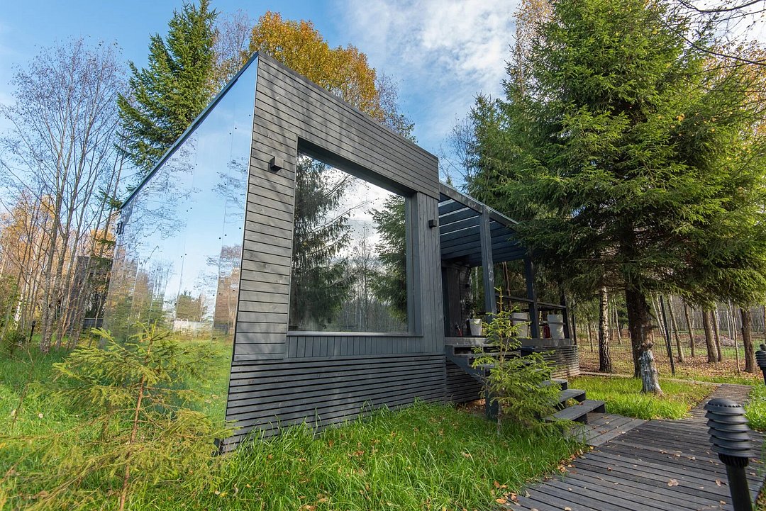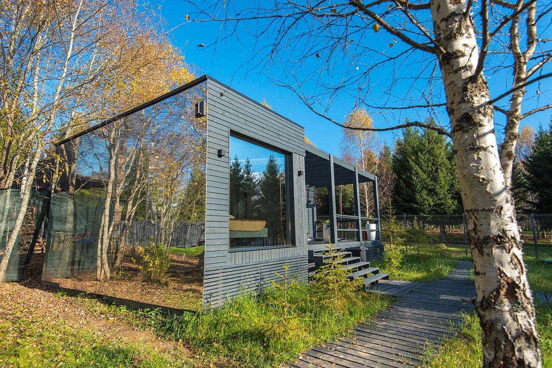 Зеркальный домик с панорамными окнами, террасой с теплой купелью, мангальной зоной на свежем воздухе — для романтического уик-энда, семейного отдыха или наедине с собой.