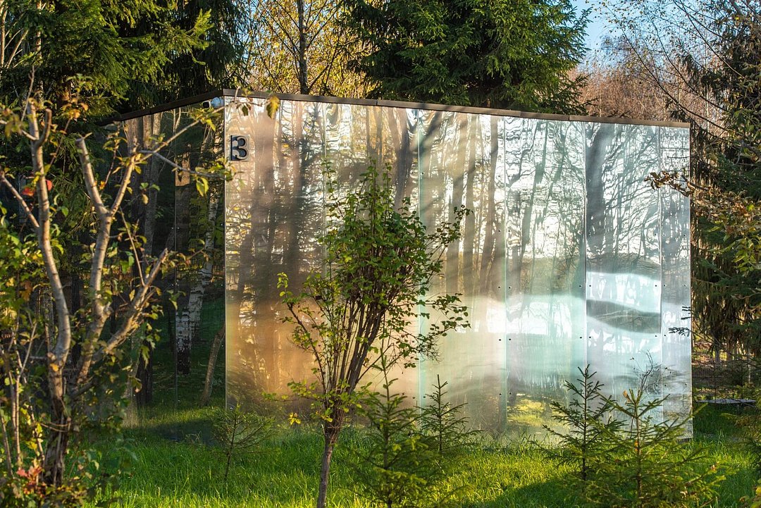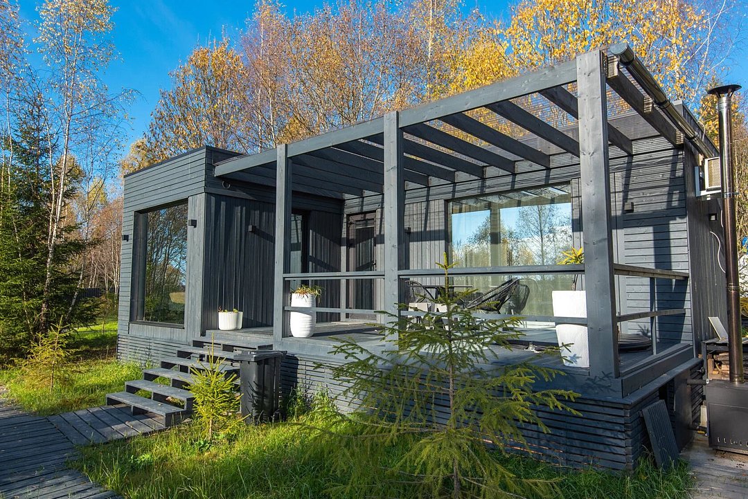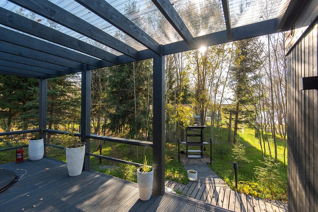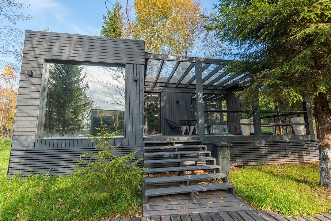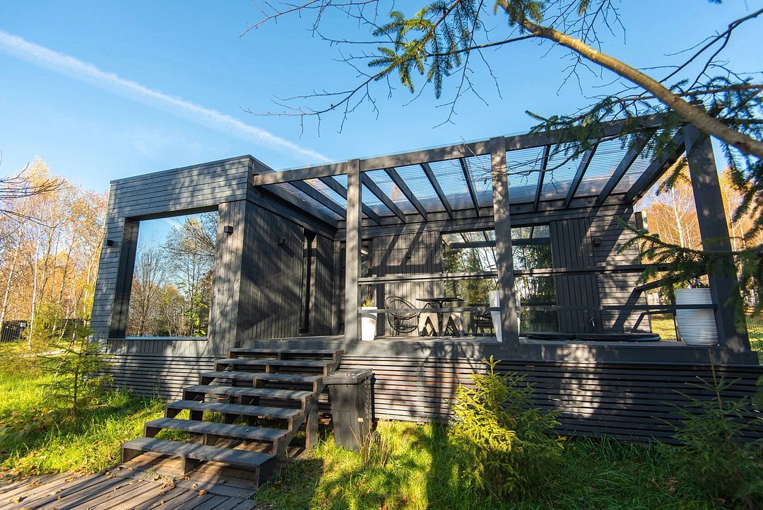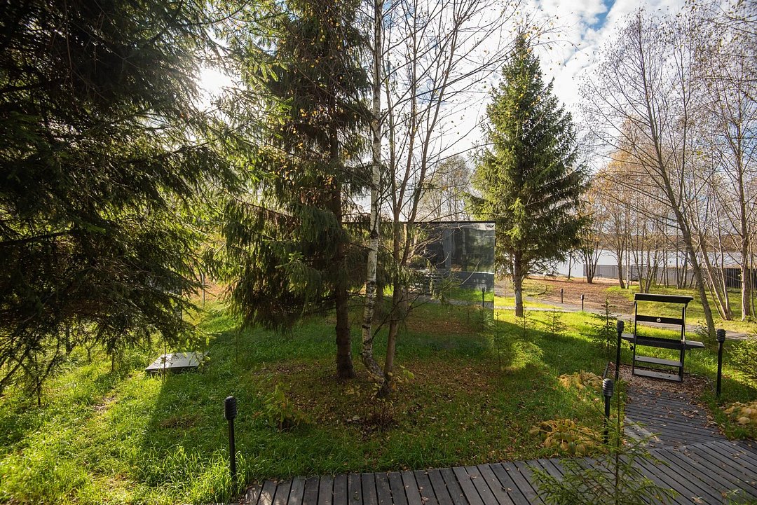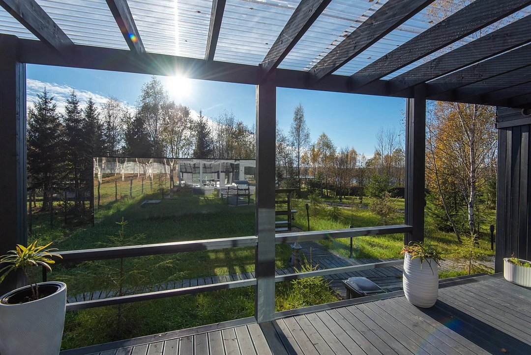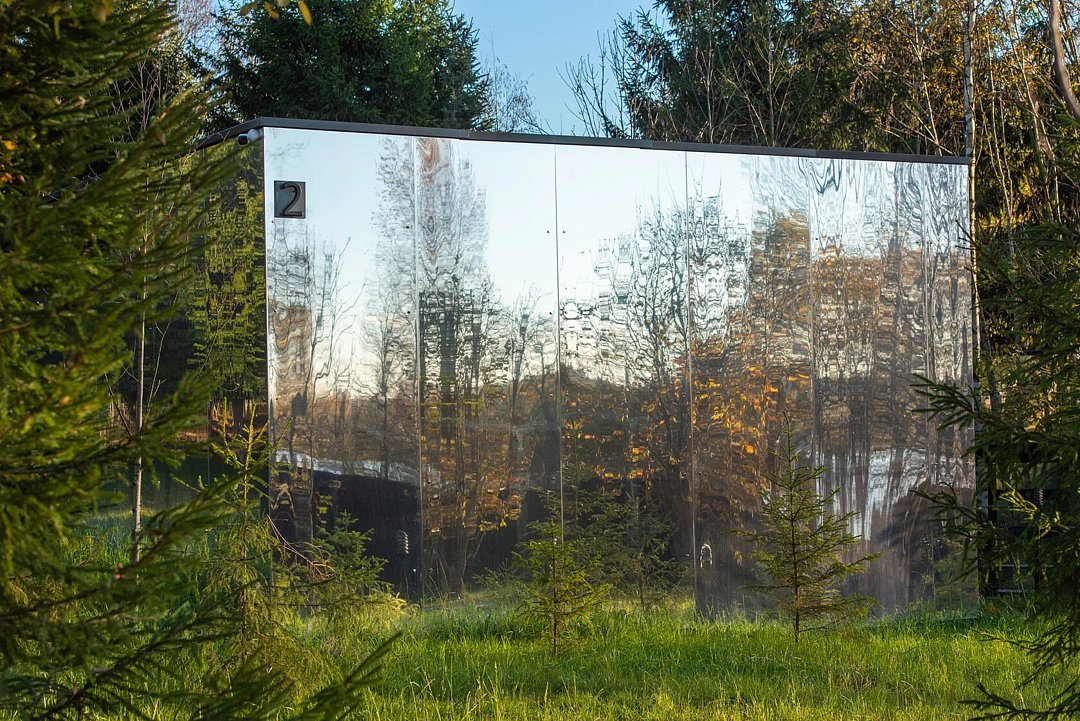 Зеркальный домик с панорамными окнами, террасой с теплой купелью, мангальной зоной на свежем воздухе — для романтического уик-энда, семейного отдыха или наедине с собой.