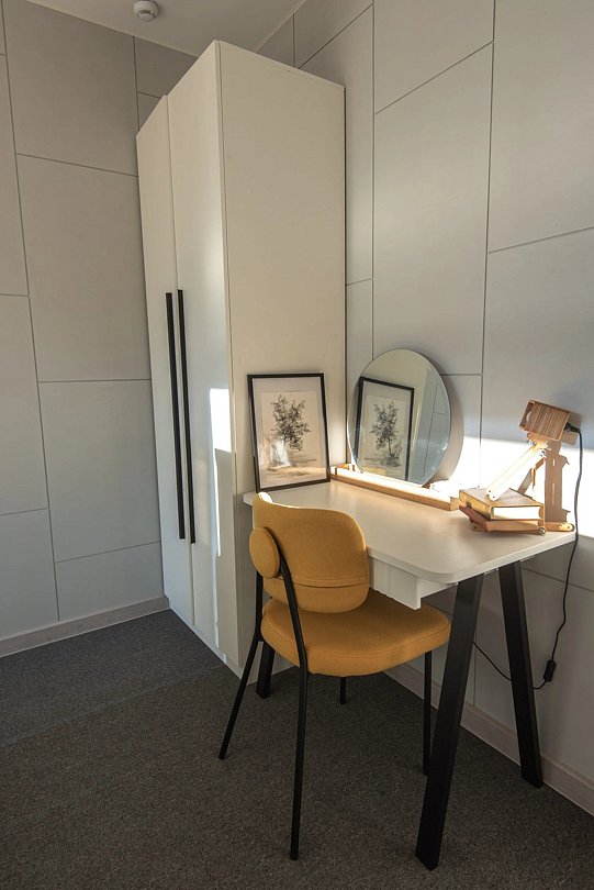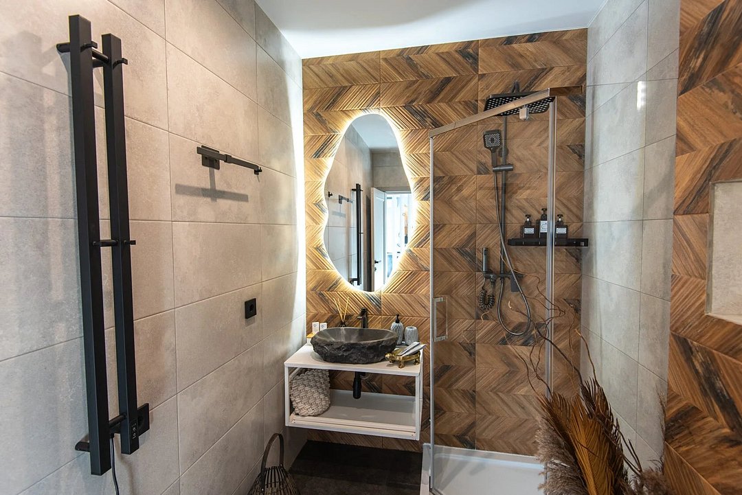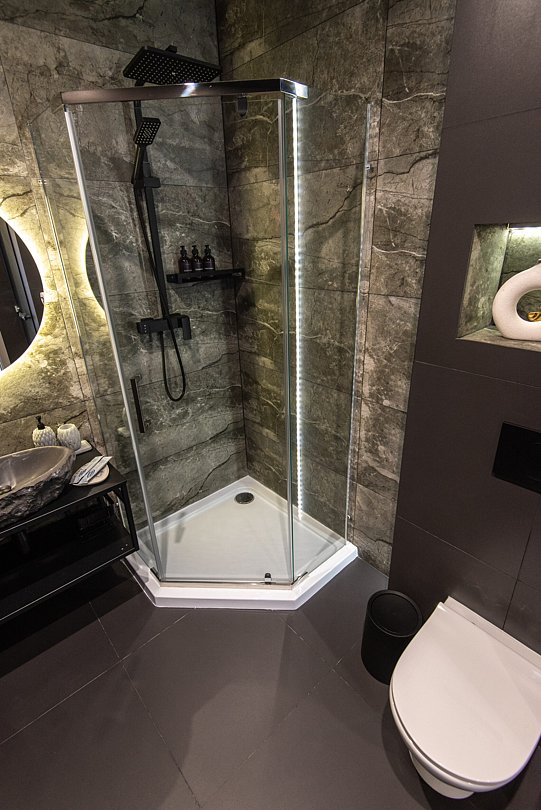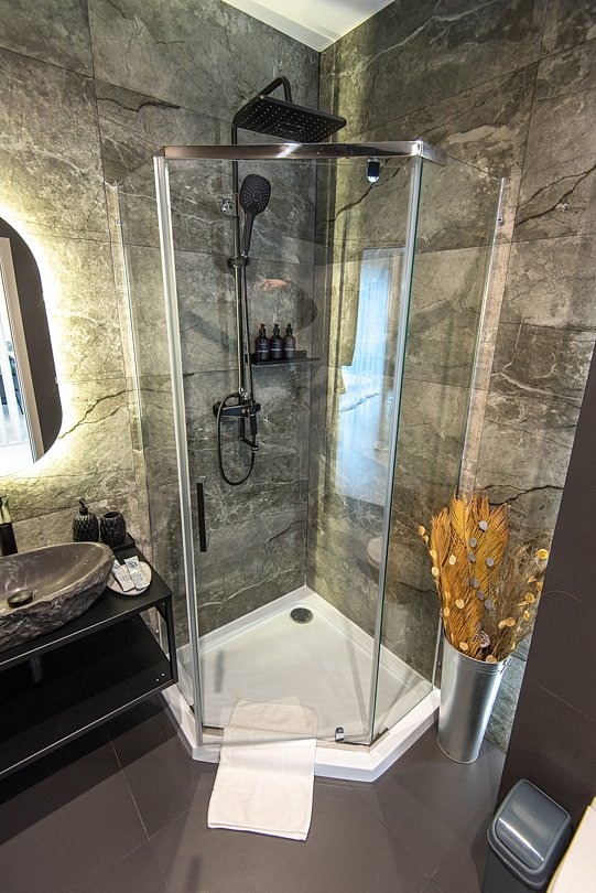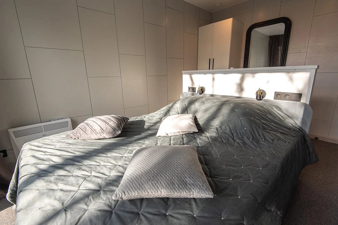 Просторный санузел с душевой кабиной. Изолированная спальня с комфортной двуспальной кроватью.