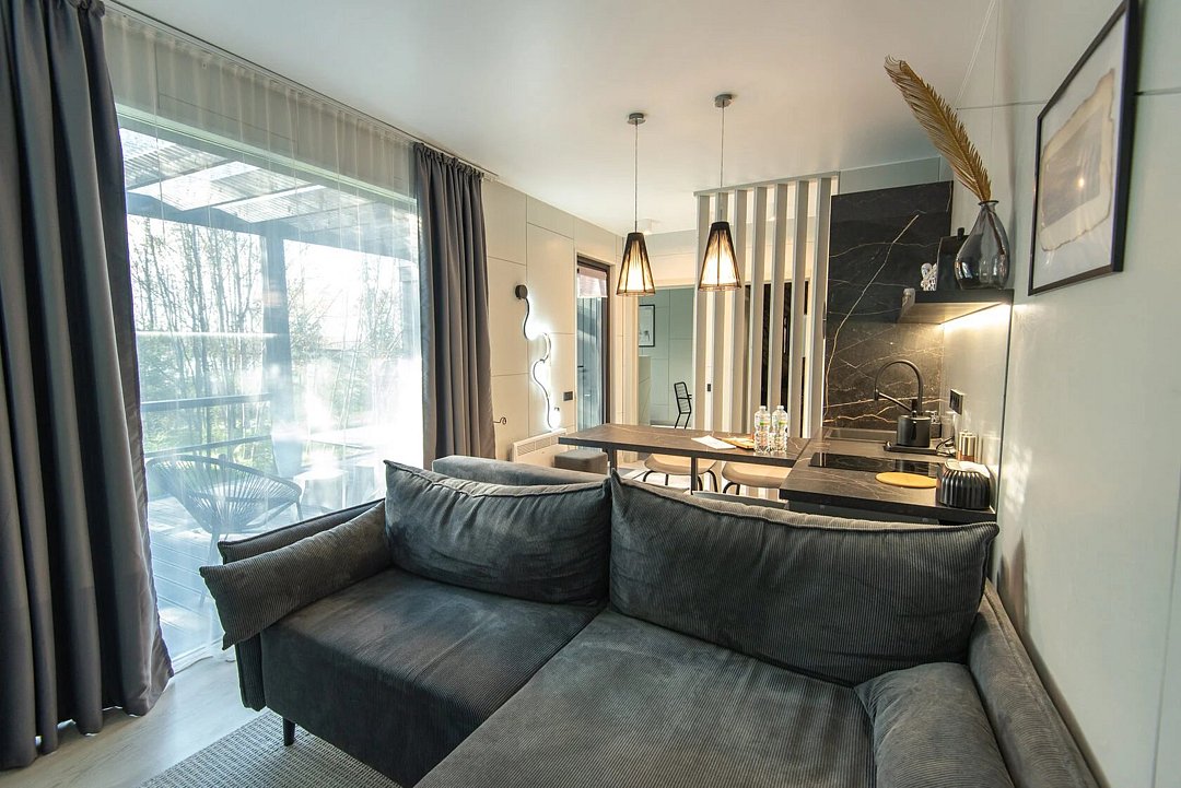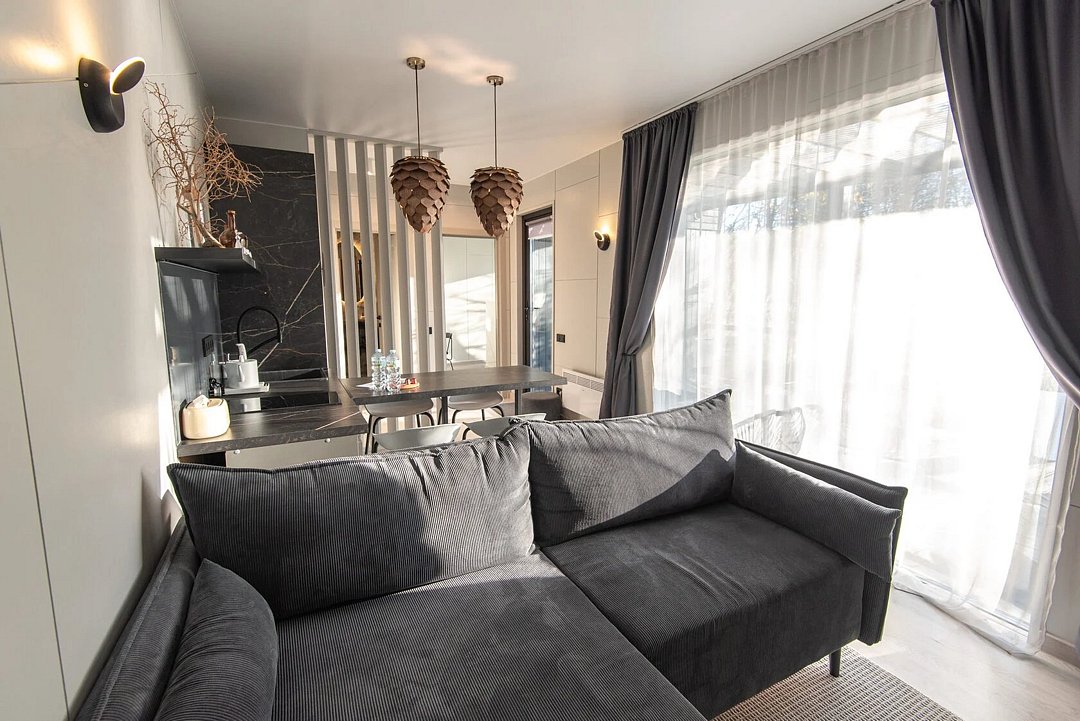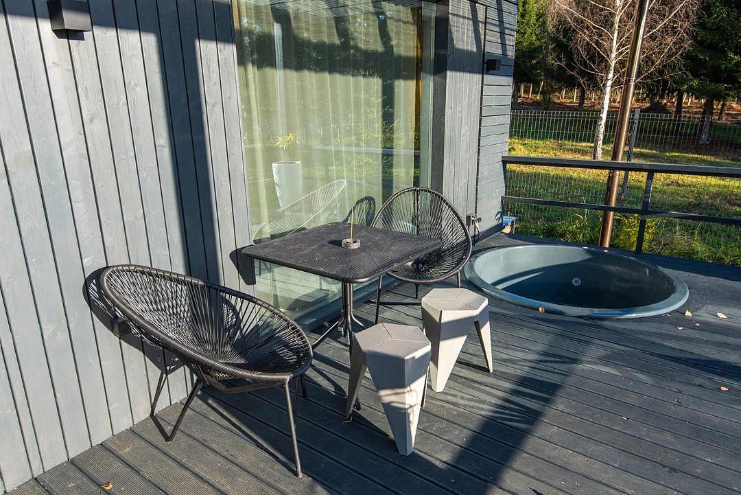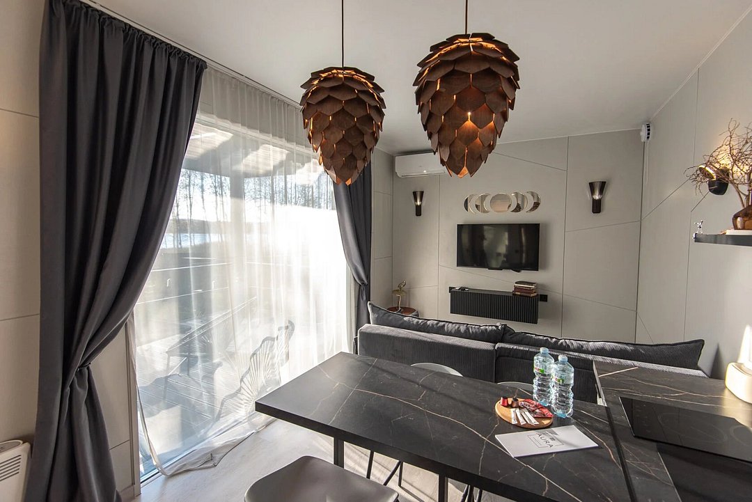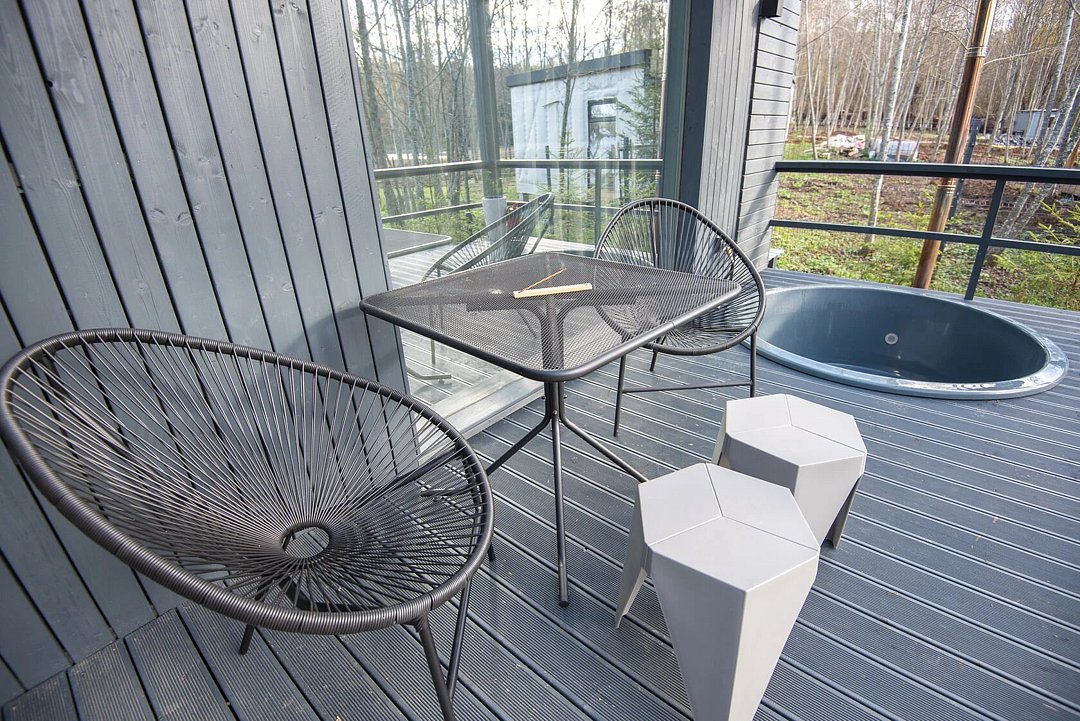 В гостиной раскладной диван, ТВ с Алисой, кондиционер, вместительные шкафы для одежды, крытая терраса, на террасе стол и стулья для комфортного отдыха, купель на каждой террасе, у каждого дома своя мангальная зона.