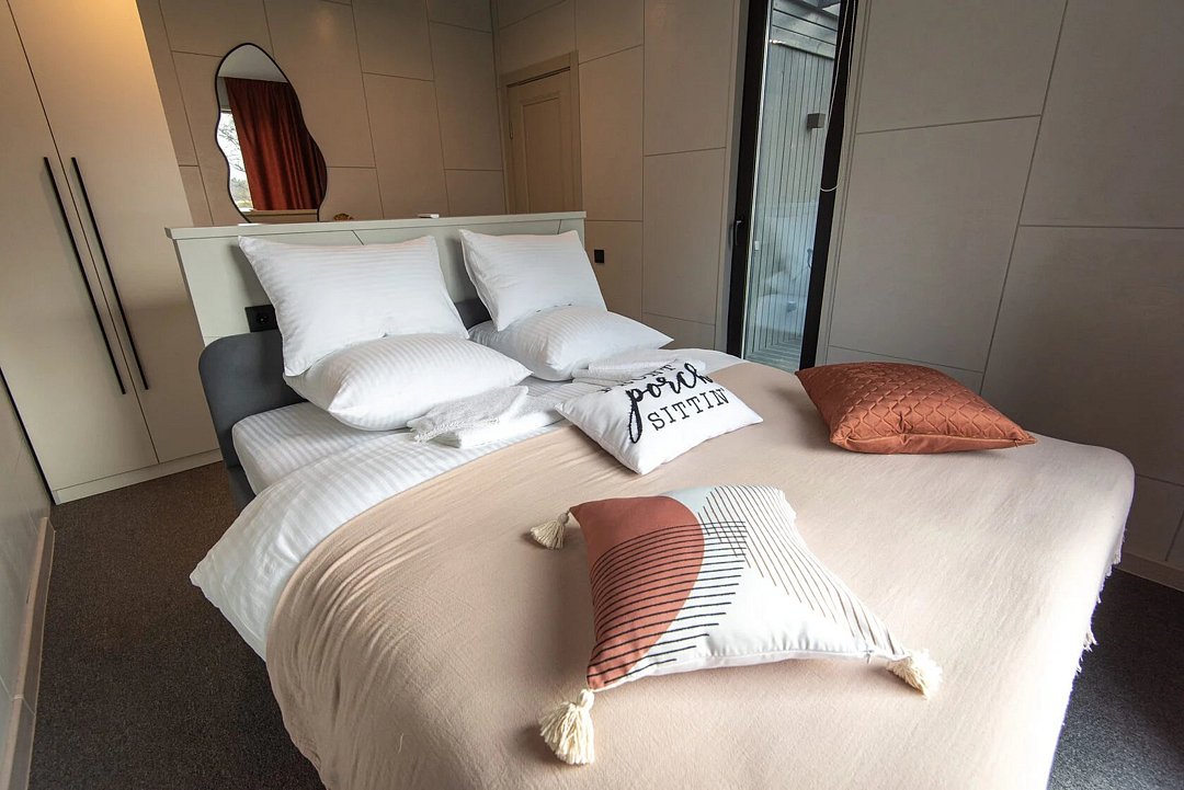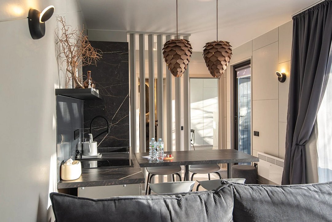 Для проживания отдыхающих подготовлены комфортабельные зеркальные дома с террасами и купелями, с изолированной спальней и авторским дизайном интерьеров. Каждый дом оснащен своей мангальной зоной, где можно организовать незабываемые вечера на свежем воздухе. Панорамные окна наполняют дома светом и позволяют любоваться красотами окружающей природы, а веранда с купелями, где можно принять СПА процедуры, станет истинным оазисом для восстановления и релаксации.