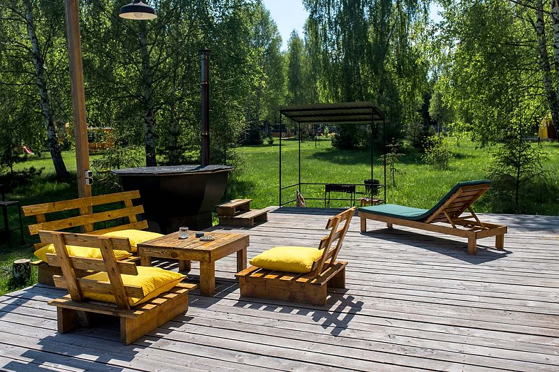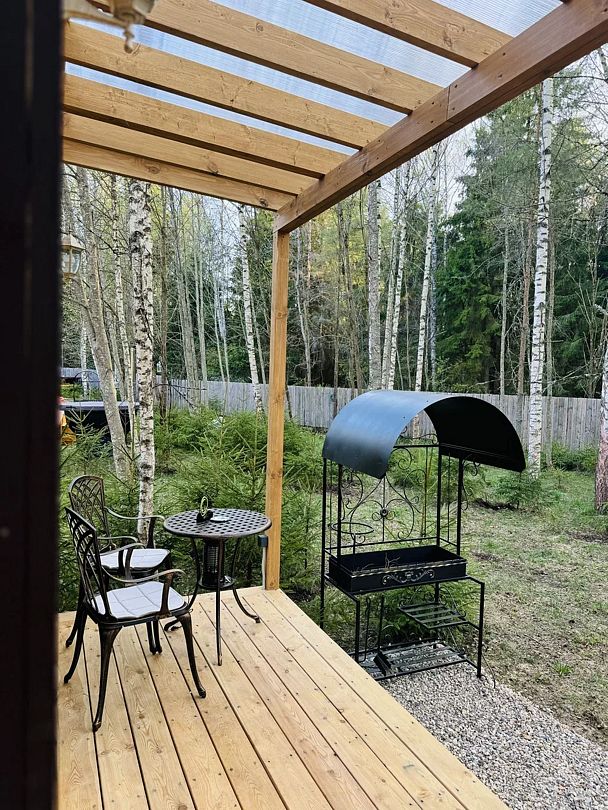 У дома есть огромная терраса с уличной мебелью, с собственной мангальной зоной и банным чаном.