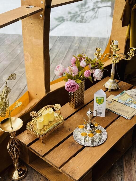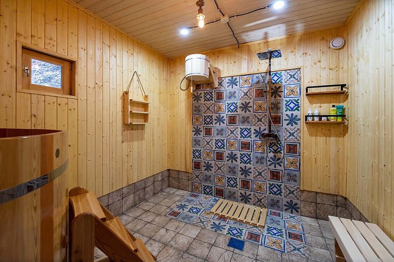 Баня расположена прямо на берегу небольшого, но очень живописного пруда. В стоимость входит посещение бани для четырех человек. Каждый дополнительный гость оплачивается отдельно, стоимость — 2000 ₽ с человека. Максимальная вместимость бани единовременно — 6 человек.