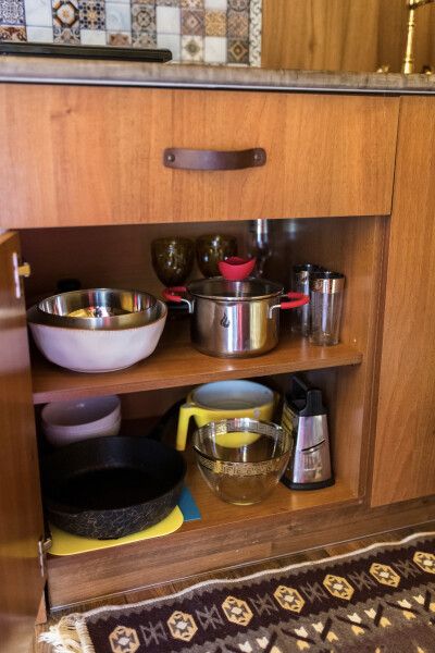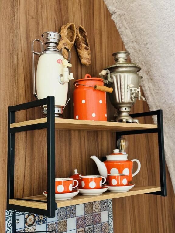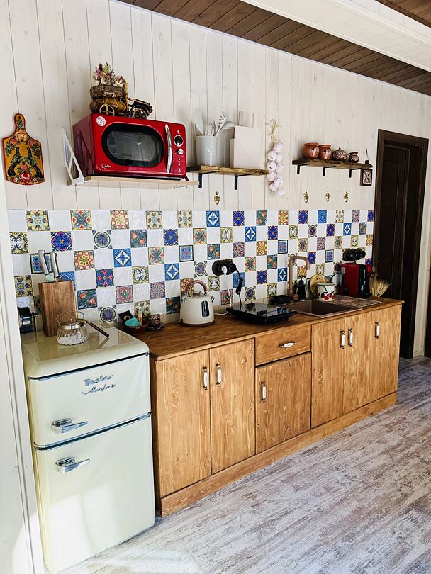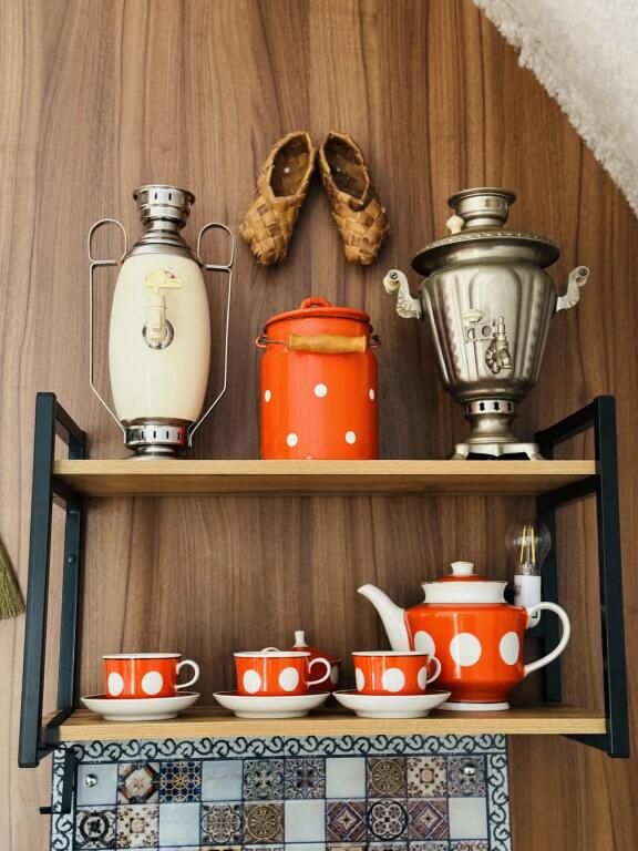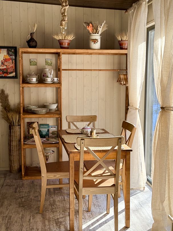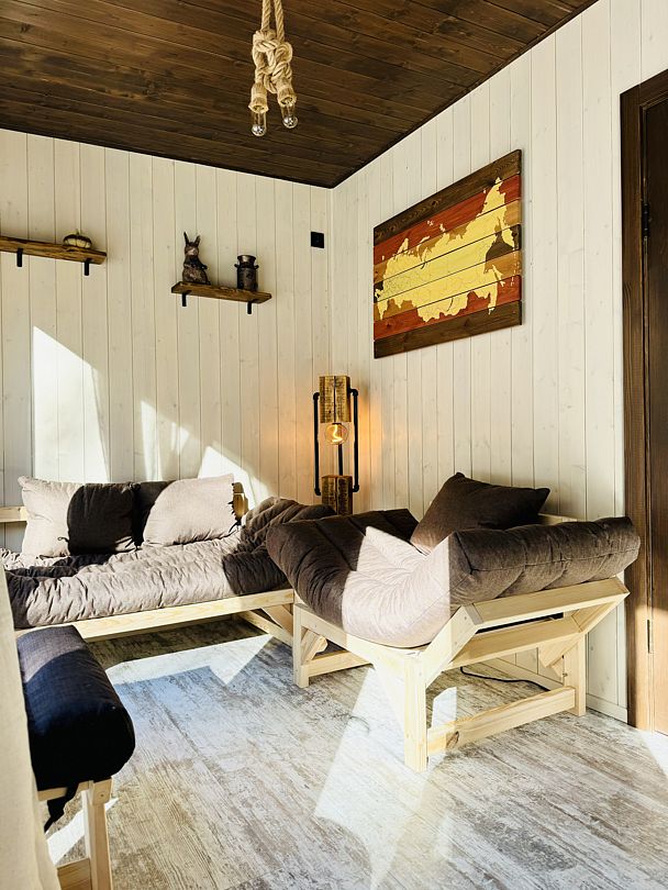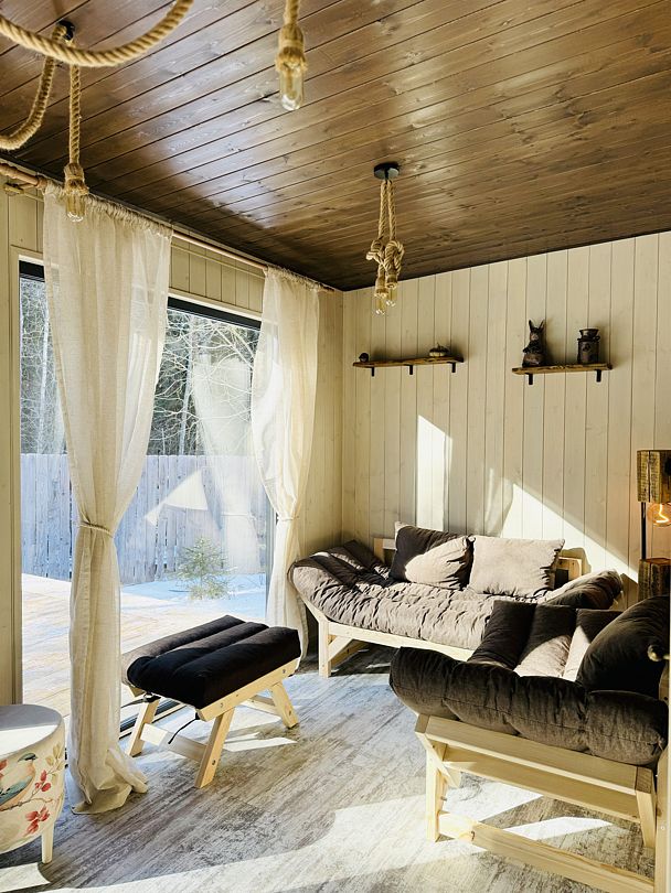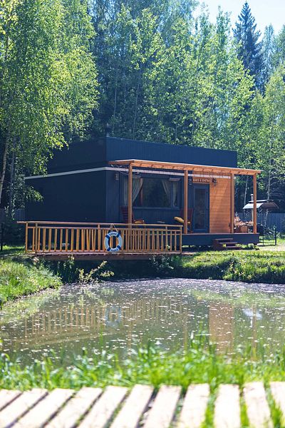 Просторный модульный дом, площадью 44 кв.м., с двумя спальнями. Дизайн интерьера выполнен в русском стиле: дерево и лён, глиняная посуда и предметы интерьера родом из СССР.