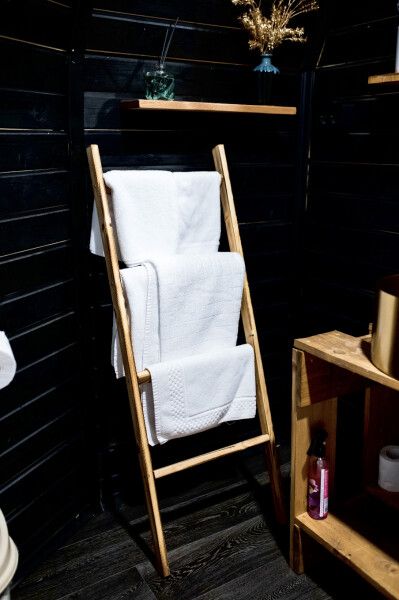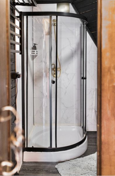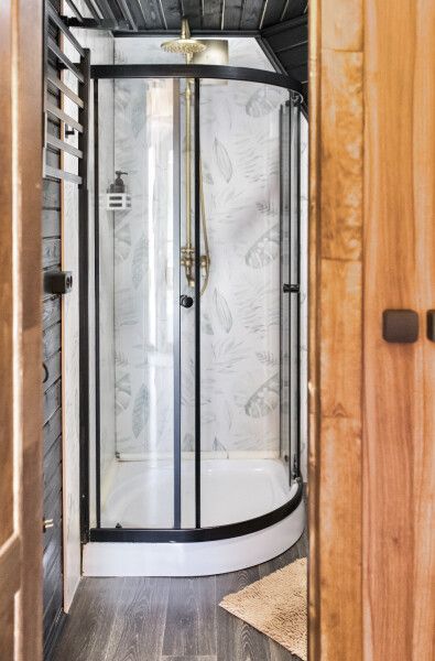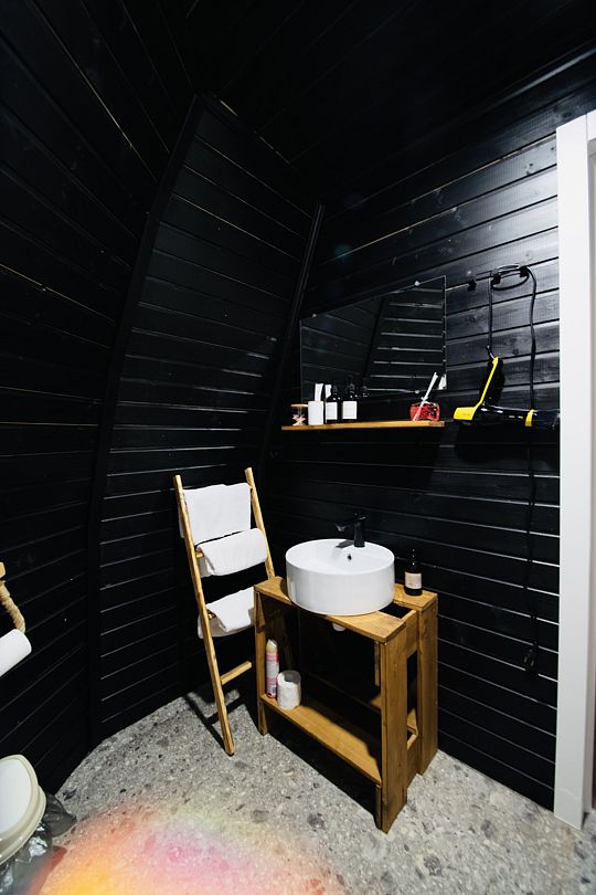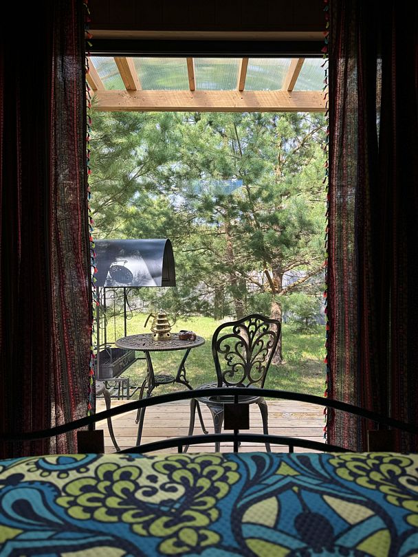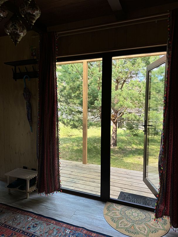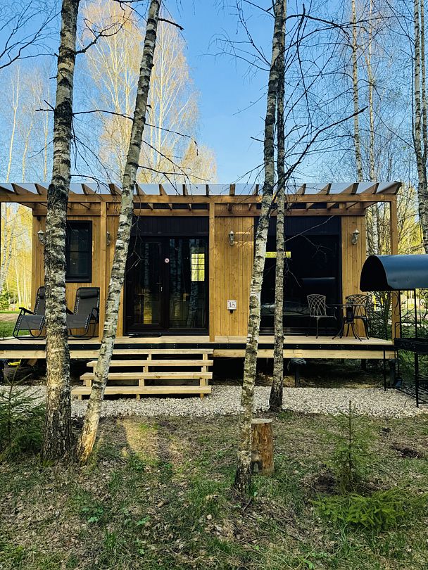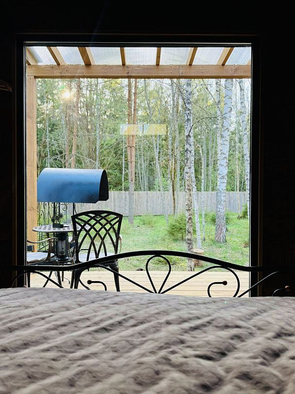 Дом отвернут от территории глэмпинга, поэтому из огромных панорамных окон открывается вид на заповедный лес. И ещё один бонус — собственный выход в лес!