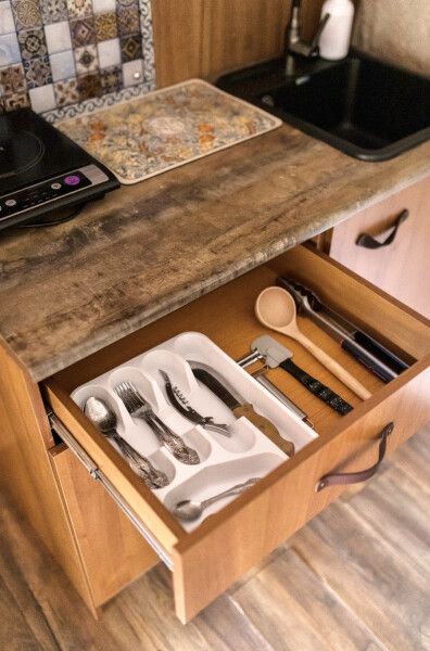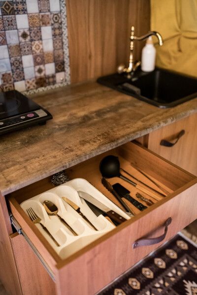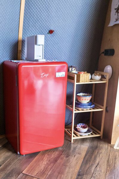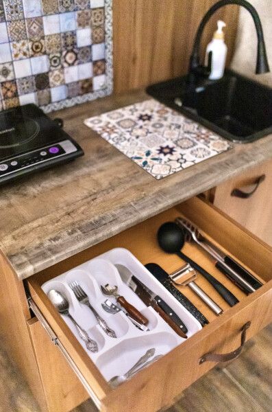 В каждом домике своя мини кухня: плита, холодильник, электрический чайник+ чайные пакетики, капсульная кофе машина + капсулы, вся необходимая кухонная утварь (чашки, тарелки, ложки, сковорода, кастрюля и т.д.).