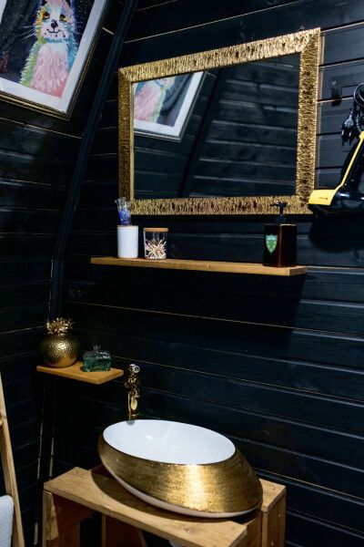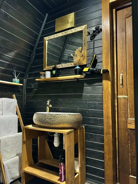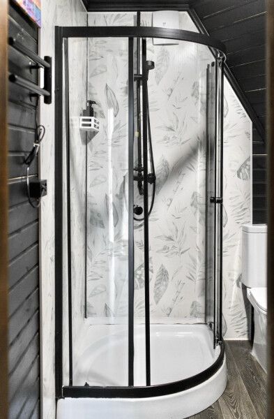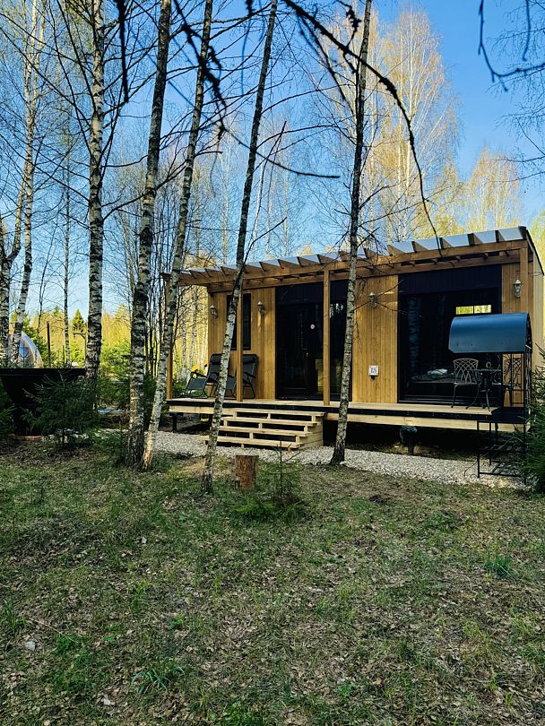 В доме есть все необходимое для комфортного проживания: большая кухня со всей необходимой посудой, холодильником, плитой, чайником, кофемашиной + капсулы, микроволновой печью. Зонированная спальня с двуспальной кроватью и панорамным окном с видом на лес, а также ванная комната с просторной душевой.