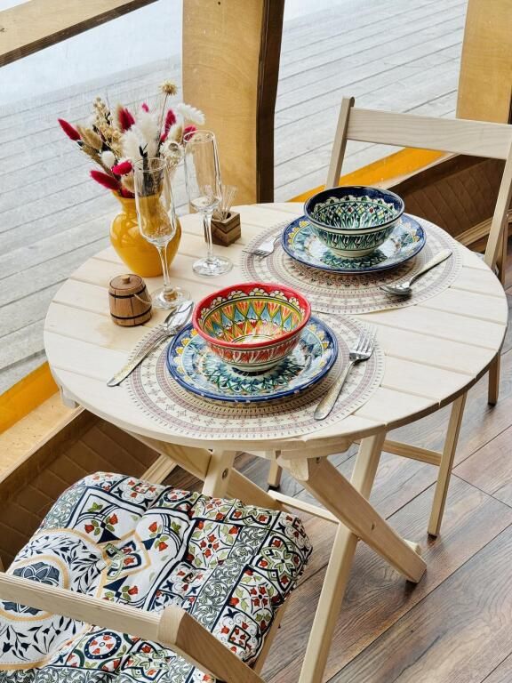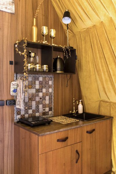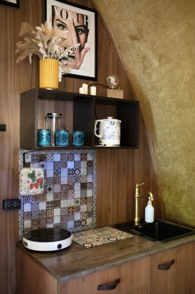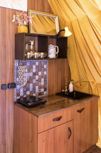 Модульный дом, площадью 21 кв.м., рассчитанный на комфортное размещение двух человек. Дизайн интерьера выполнен в восточном стиле: ручная роспись, мозаика, красочные орнаменты и предметы интерьера из Марокко и Ирана.