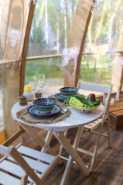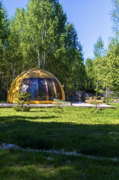 В сфере есть всё для комфортного отдыха: кондиционер, санузел, душ, фен, кухня со всем необходимым оборудованием и посудой, кофемашина. В вашем распоряжении огромная личная веранда с садовой мебелью, шезлонгом и мангальной зоной. А еще в этой сфере есть возможность арендовать горячий банный чан.