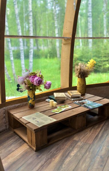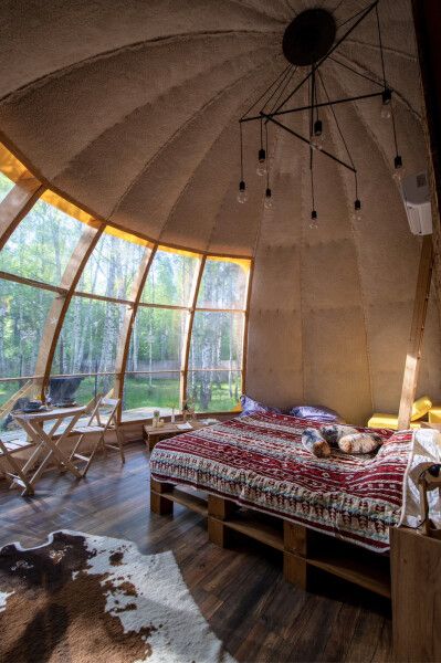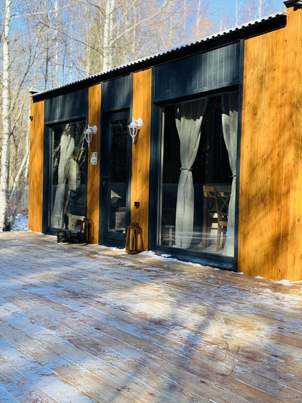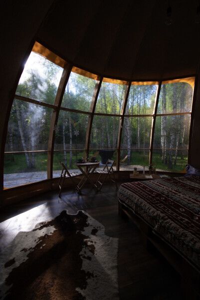 Дом отвернут от территории глэмпинга, поэтому из огромных панорамных окон открывается вид на заповедный лес.