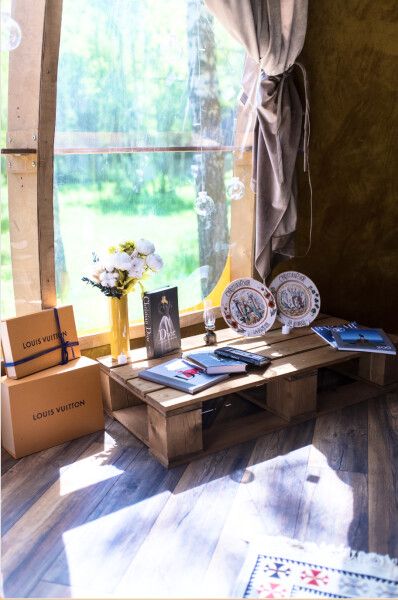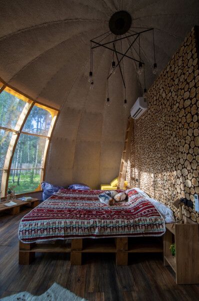 Футуристичная и уютная сфера с можжевеловой стеной и предметами интерьера из можжевельника, обшитая мягким, плюшевым мехом в светлых тонах. Из панорамного окна сферы открывается роскошный вид на лес.