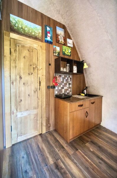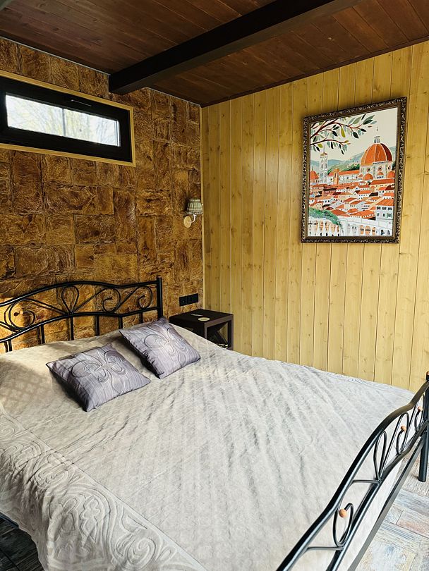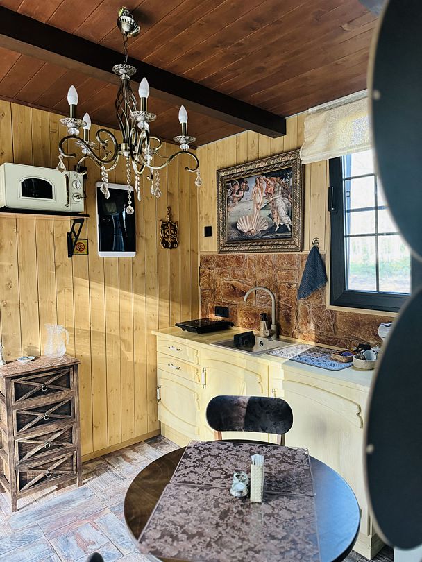 Модульный дом, площадью 21 кв.м., рассчитанный на комфортное размещение двух человек. Дизайн интерьера выполнен в итальянском стиле: стены из камня, массивные потолочные балки, фрески и предметы интерьера из Флоренции.