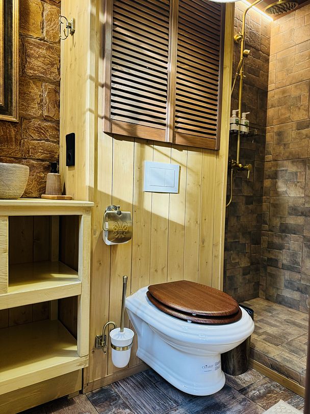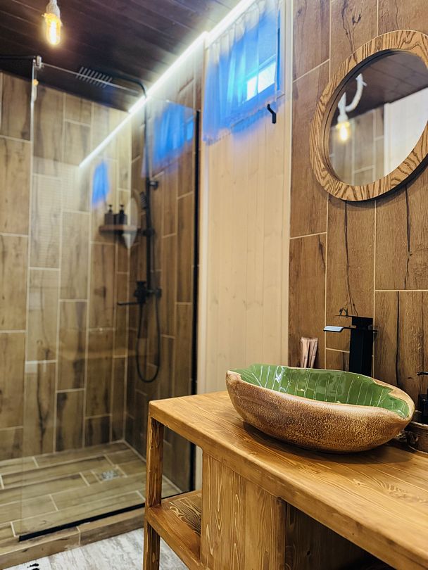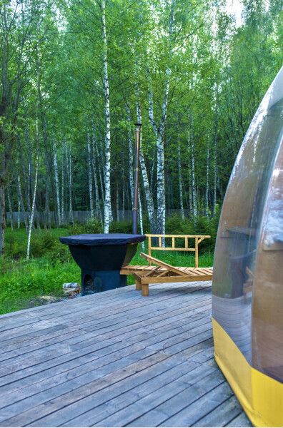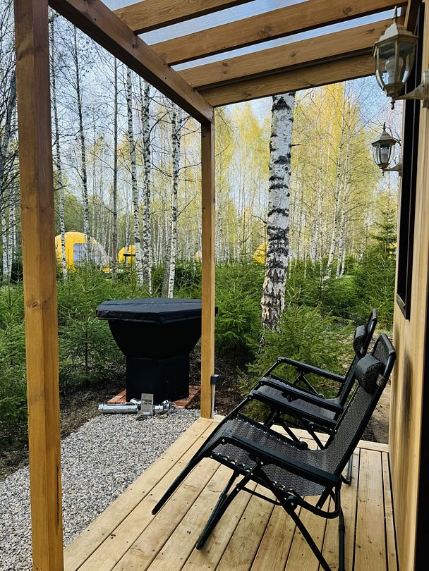 В сфере есть всё для комфортного отдыха: кондиционер, санузел, душ, фен, кухня со всем необходимым оборудованием и посудой, кофемашина. В вашем распоряжении огромная личная веранда с садовой мебелью, шезлонгом и мангальной зоной. Именно на веранде расположен индивидуальный горячий банный чан.