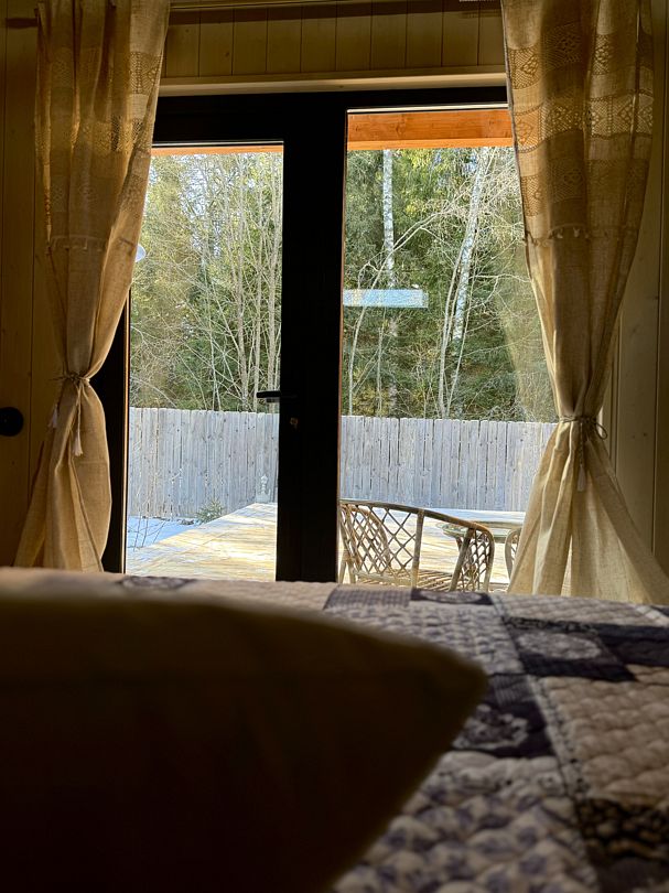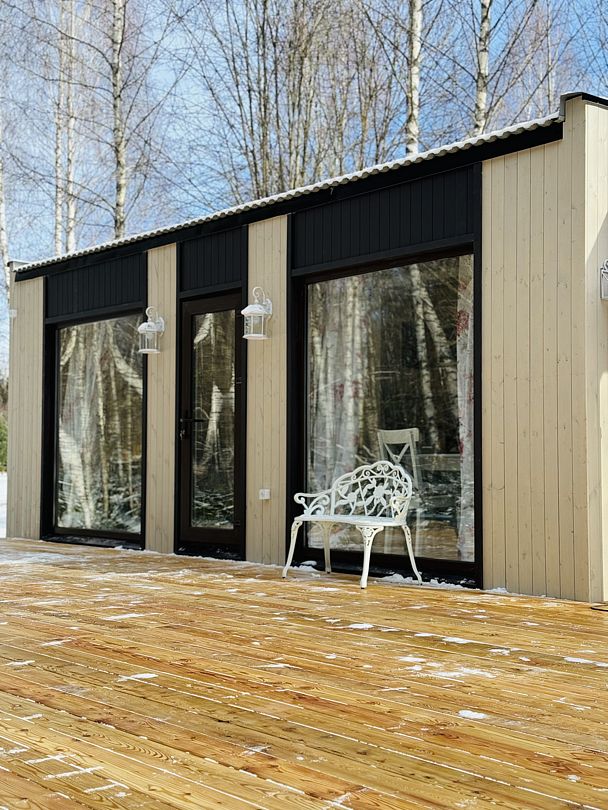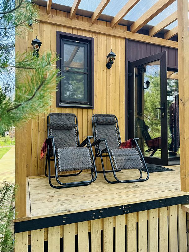 Дом отвернут от территории глэмпинга, поэтому из огромных панорамных окон открывается вид на заповедный лес. И ещё один бонус — личный сад окруженный хвойными деревьями!