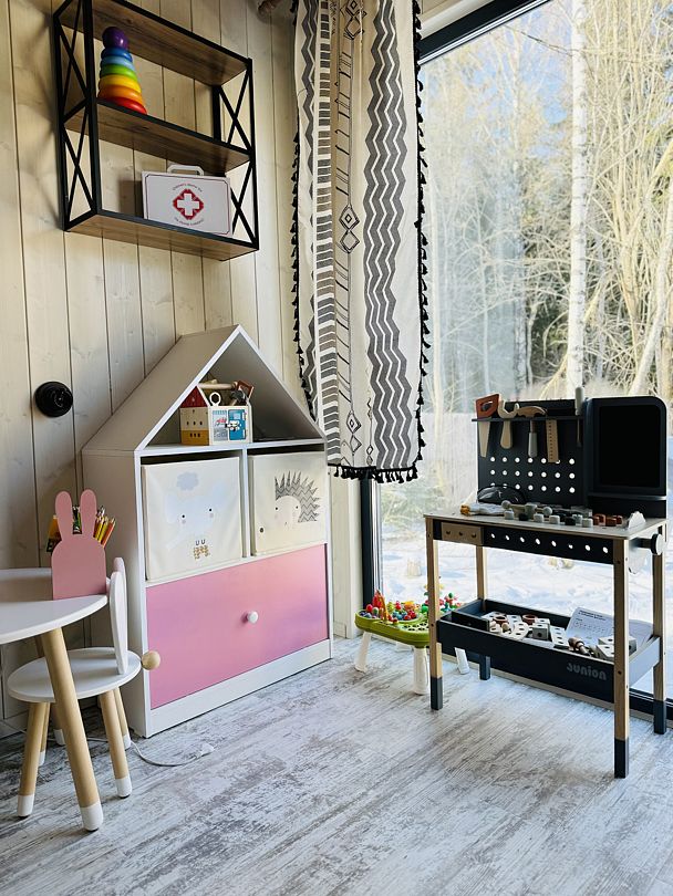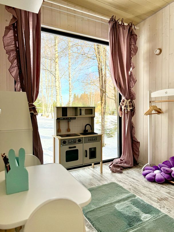 В доме есть все необходимое для комфортного проживания: большая кухня со всей необходимой посудой, холодильником, плитой, чайником, кофемашиной + капсулы, микроволновой печью. Гостиная, ванная комната с просторной душевой, а также две спальни: одна с большой двуспальной кроватью, а вторая предназначена для наших маленьких гостей — с игрушками и двухъярусной кроватью, размер каждого спального места 90*200.