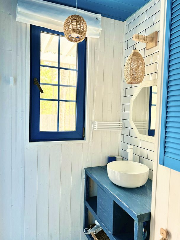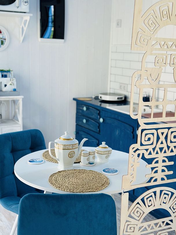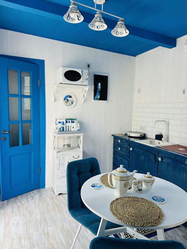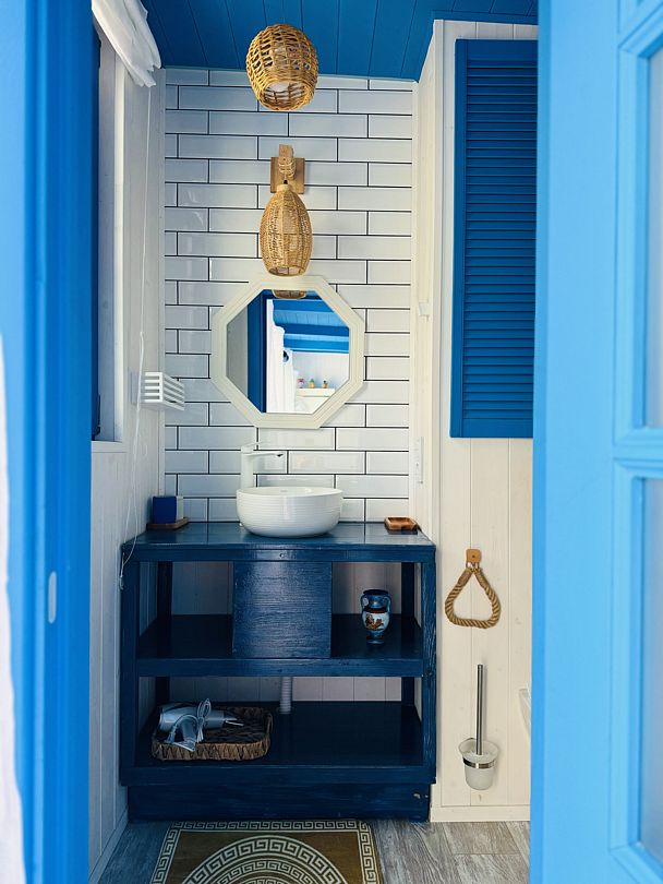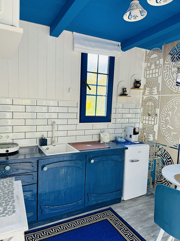 Модульный дом, площадью 21 кв.м., рассчитанный на комфортное размещение двух человек. Дизайн интерьера выполнен в греческом стиле: сочетание белых и синих оттенков, массивные потолочные балки, элементы декора, отображающие местный колорит и предметы интерьера с острова Санторини.