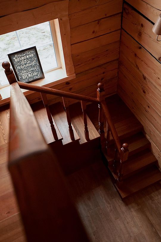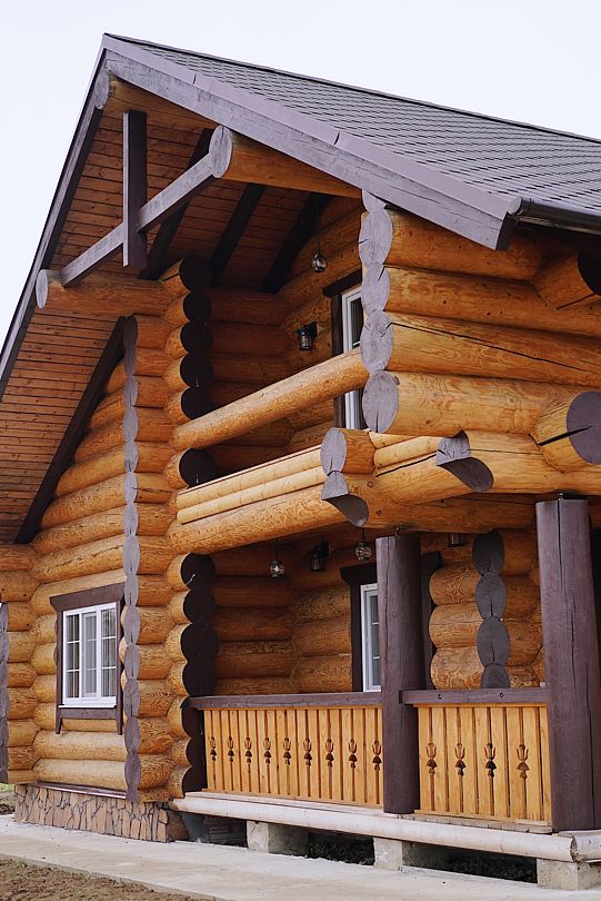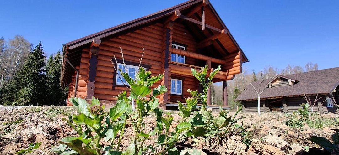 Двухэтажный сосновый сруб из массивных бревен, общей площадью сто восемьдесят восемь квадратных метров, с балконами и террасами более двухсот квадратных метров, с видами на лес и территорию. Дизайнерская отделка с использованием натуральных материалов.