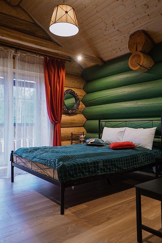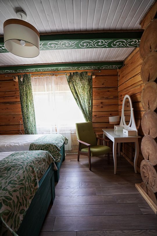 Комнаты на втором этаже — комната ОЛЕНЬ (двуспальная кровать, полноценный санузел с раковиной, унитазом и душем), большой балкон с видом на хутор и «уголком интроверта». Солнце с утра. Комната ВОЛК (огромная двуспальная кровать, полноценный санузел с раковиной, унитазом и душем), большой балкон с видом на лес. Солнце после обеда.
