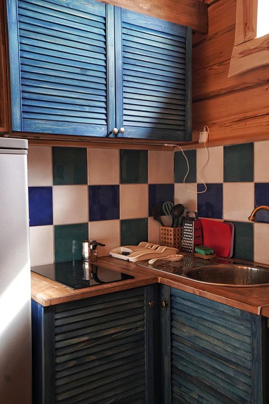 Мини-холодильник и кухонный уголок, где предусмотрена плита. Вся необходимая посуда, чтобы чувствовать себя как дома. Уютные постельные принадлежности, полотенца, тапочки, банные шапки и халаты для вашего комфорта.