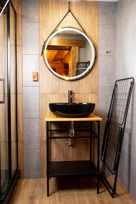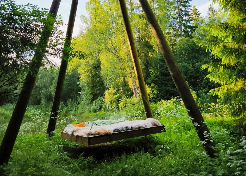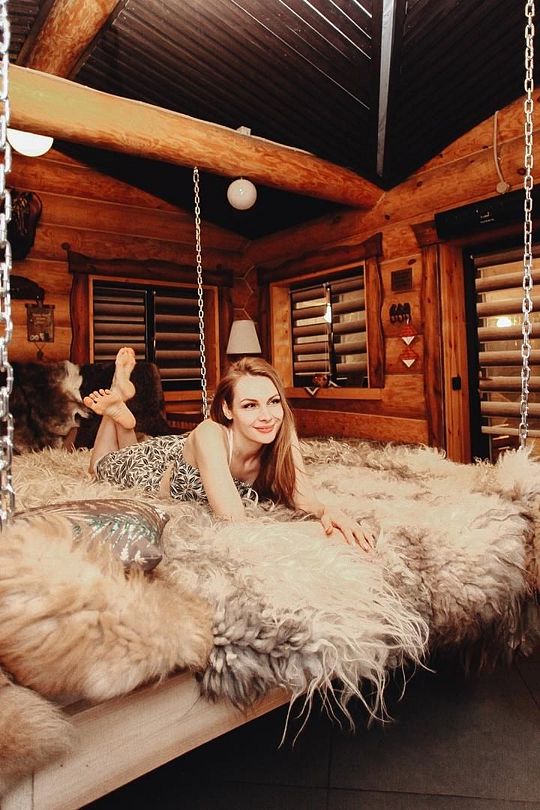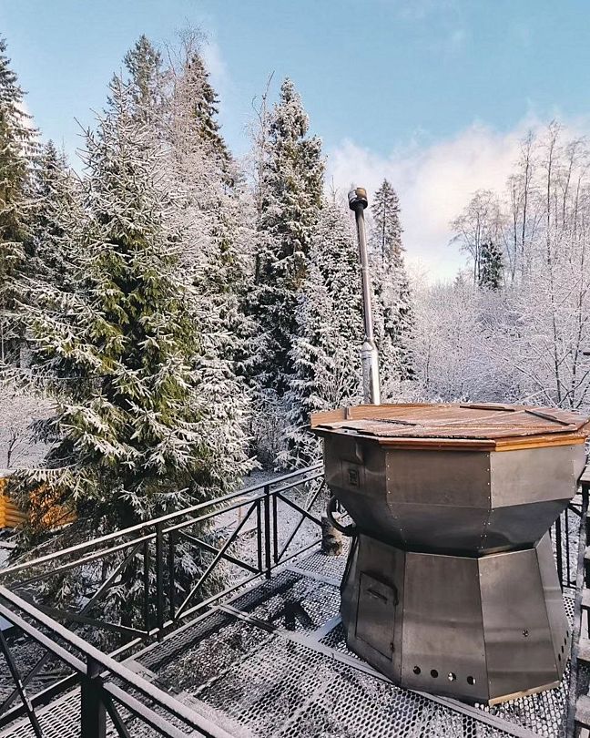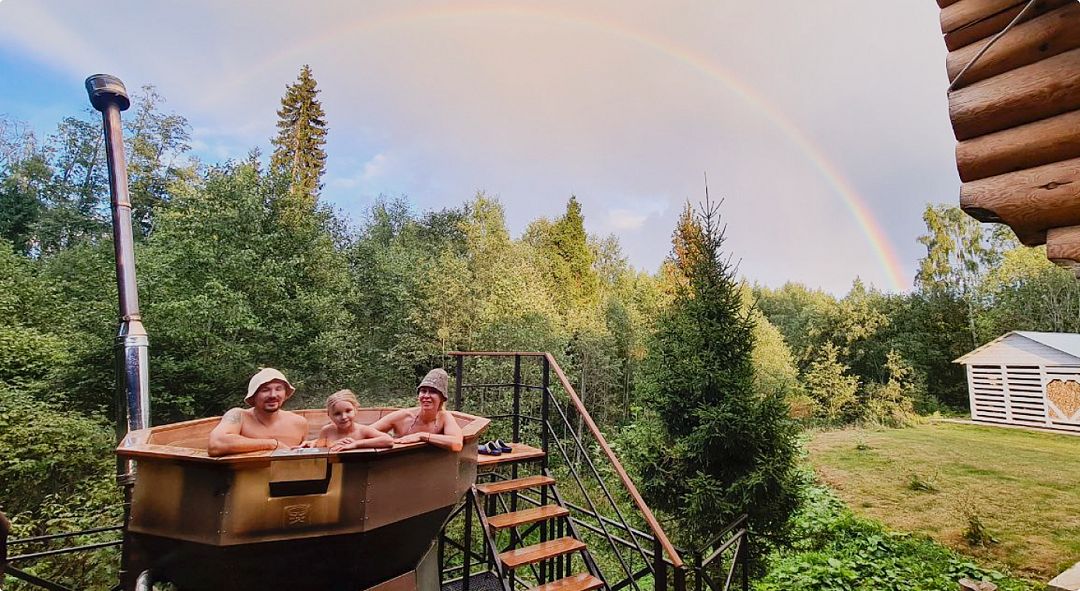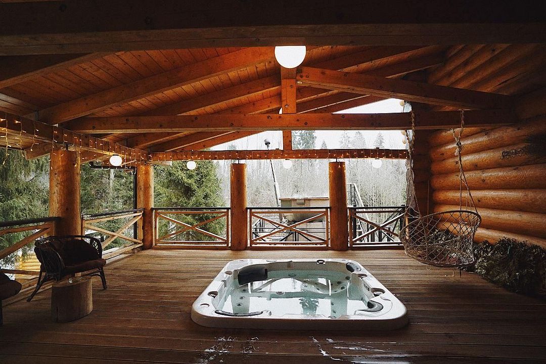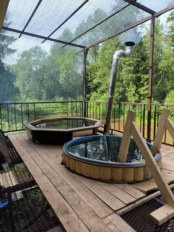 Гостям доступна настоящая парная с открытой каменкой, джакузи на открытой террасе с видом на лес, большой горячий чан с гидромассажем, а также купель с родниковой водой. Уютную атмосферу создают камин с открытым огнем, большие банные качели и сеновал под звездным небом. Также предусмотрены удобства, такие как санузел с душем и две просторные комнаты для отдыха.