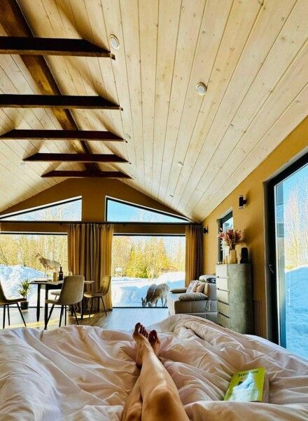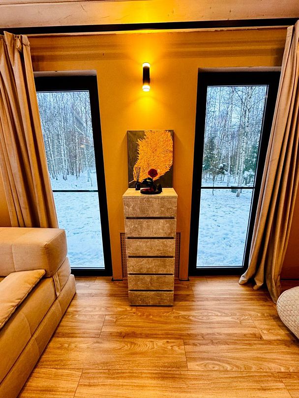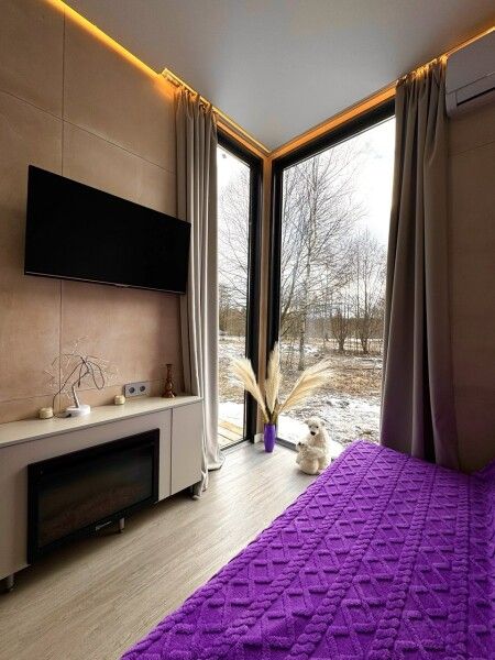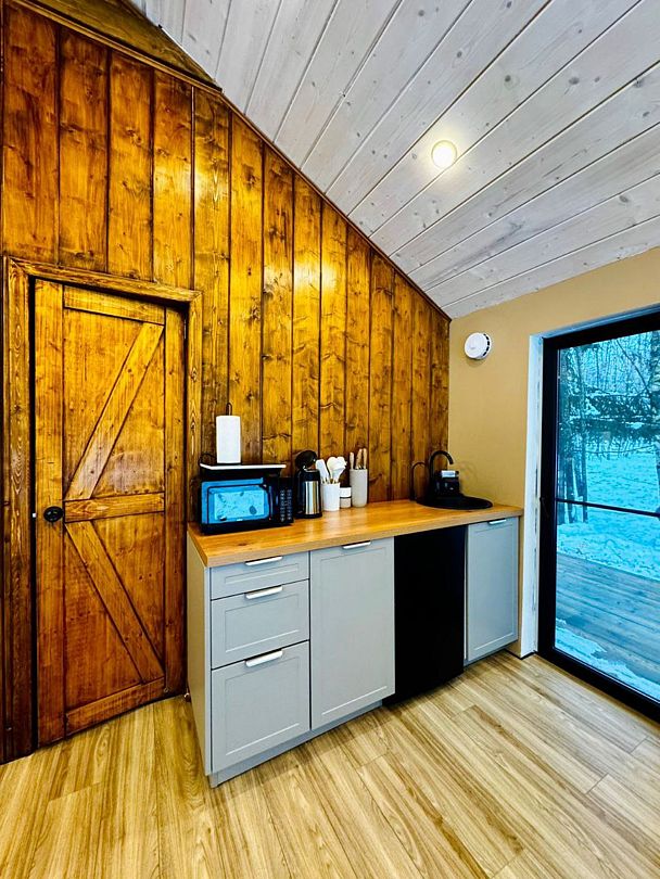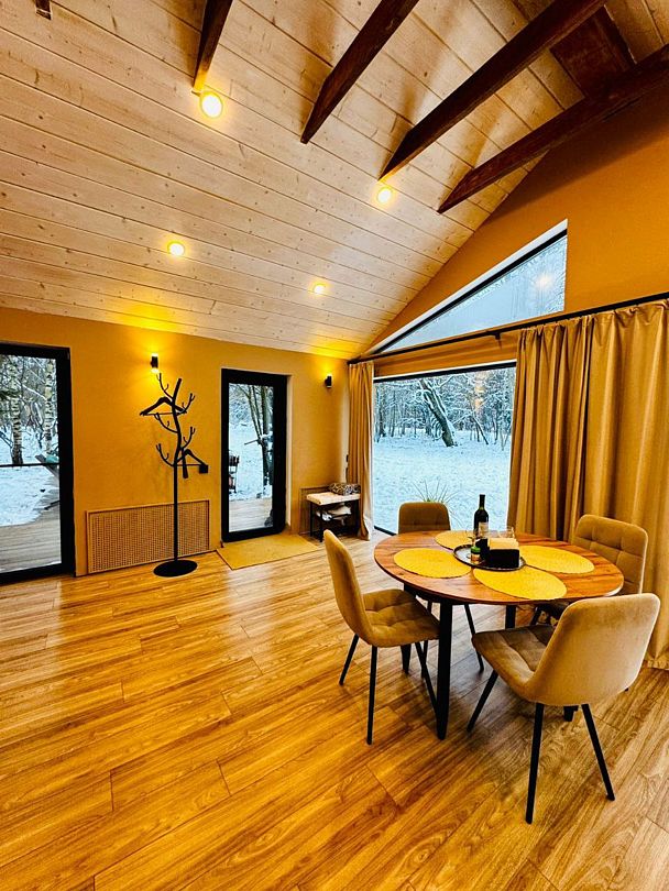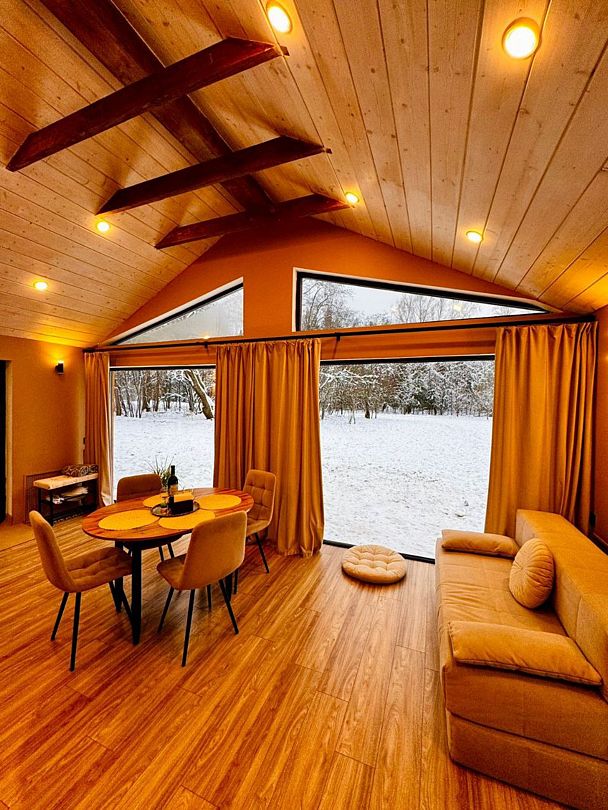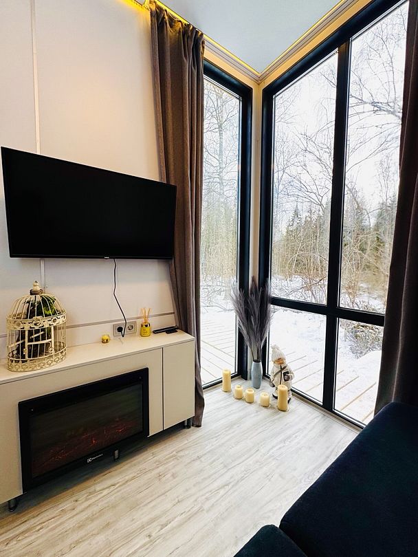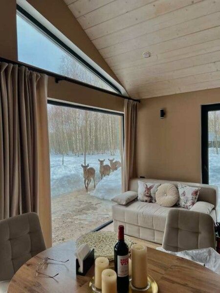Большая двуспальная кровать 180/200, просторная кухня-столовая, гостиная с диваном, трансформирующимся в 2-х спальные места, санузел, теплый пол, открытая терраса с панорамным видом на лес, с которой можно кормить оленей и кроликов. В доме реализована финская концепция панорамного остекления — из любой части дома через окно виден лес. Перед домом костровая чаша и мангальная зона.