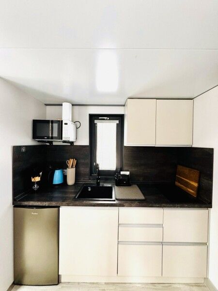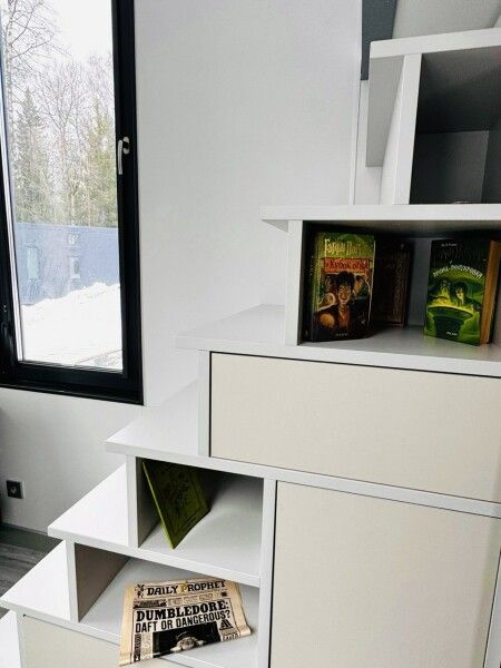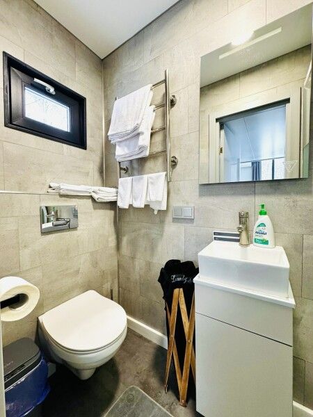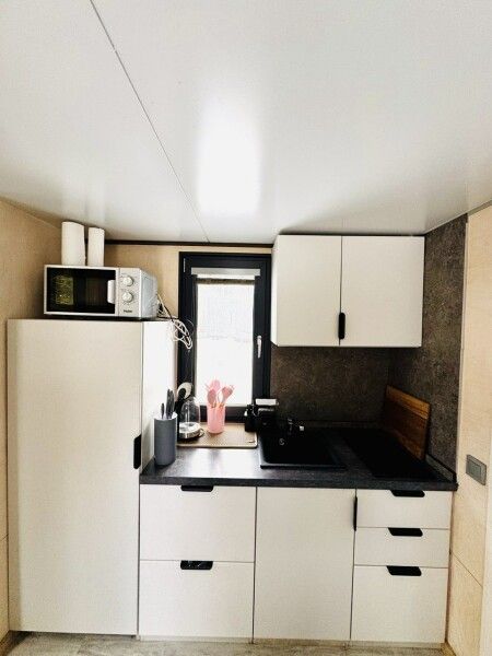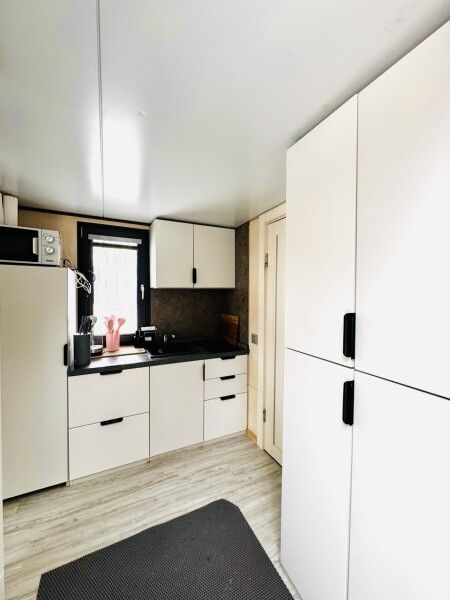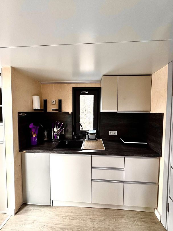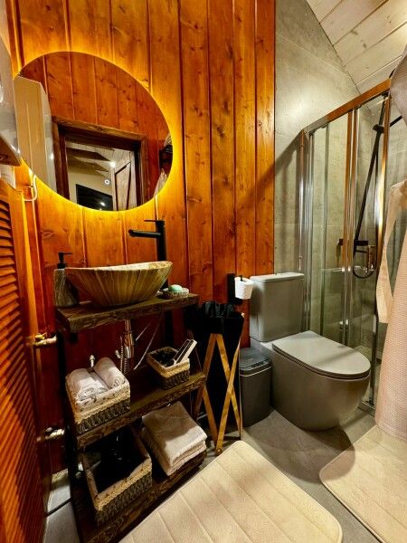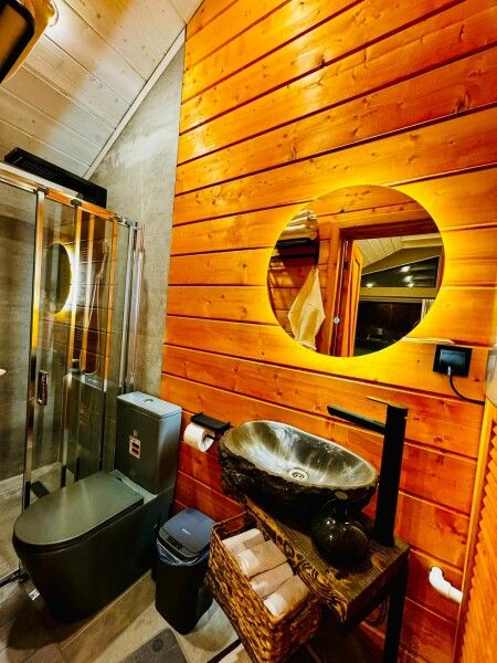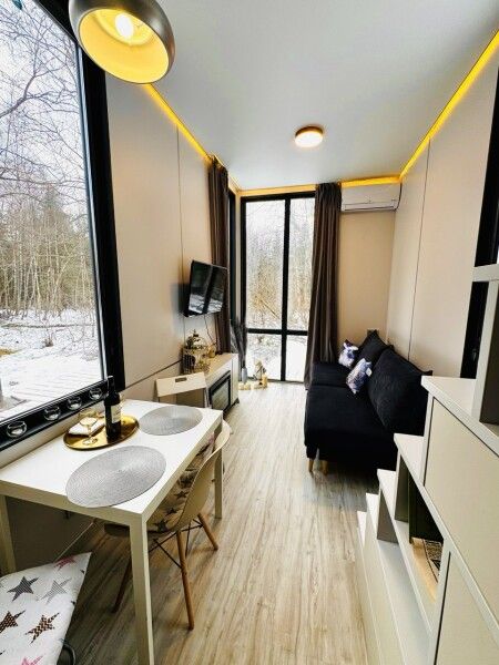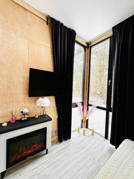 Большая двуспальная кровать 180/200, просторная кухня-столовая, гостиная с диваном, трансформирующимся в 2-х спальные места, санузел, теплый пол, открытая терраса с панорамным видом на лес, с которой можно кормить оленей и кроликов. В доме реализована финская концепция панорамного остекления — из любой части дома через окно виден лес. Перед домом костровая чаша и мангальная зона.