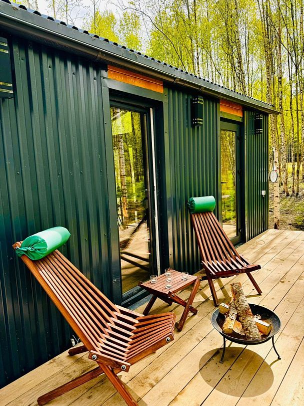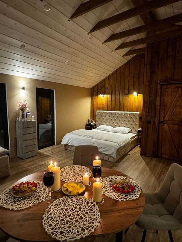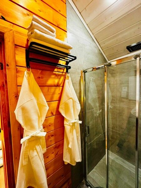 Для проживания гостей предлагаются уютные гостевые домики с панорамными окнами и собственным банным чаном, оснащенные всем необходимым для комфортного проживания. Каждый домик оборудован двуспальной кроватью и раскладным диваном. Из больших окон открывается потрясающий вид на пастбища, где мирно пасутся лошади и олени. Для приготовления блюд на свежем воздухе у каждого дома оборудованы мангальные зоны.