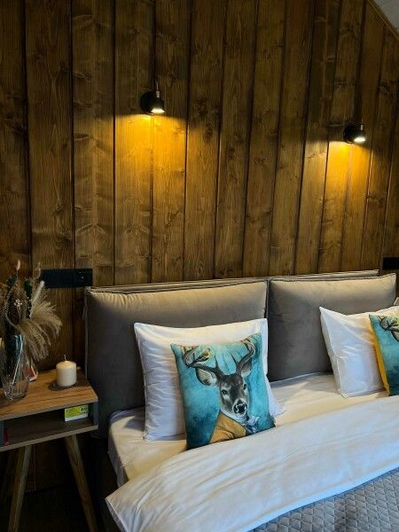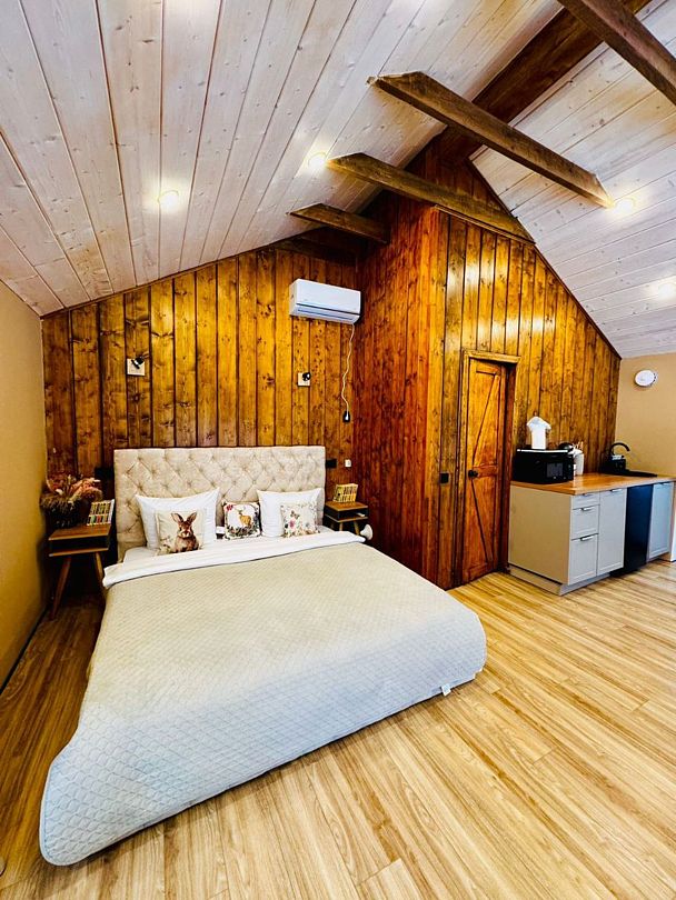 Большая двуспальная кровать 180/200, просторная кухня-столовая, гостиная с диваном, трансформирующимся в 2-х спальные места, санузел, теплый пол, открытая терраса с панорамным видом на лес, с которой можно кормить оленей и кроликов.