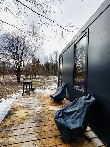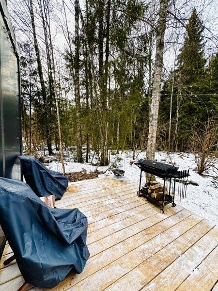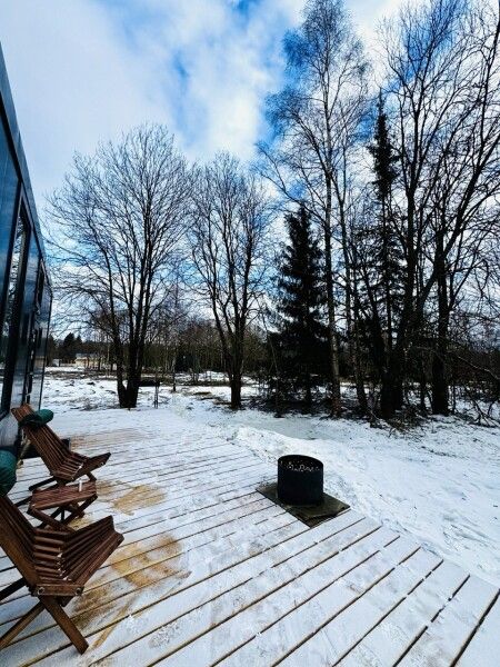 В доме реализована финская концепция панорамного остекления — из любой части дома через окно виден лес. Перед домом костровая чаша и мангальная зона.