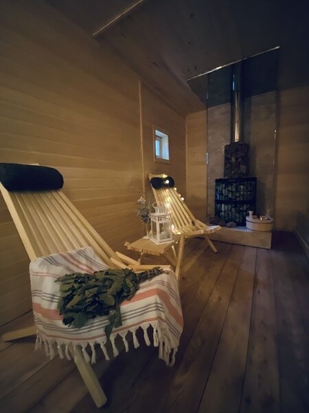 Прямо в домиках находится баня на березовых дровах с парной. Постельное белье и полотенца для проживания предоставляются.