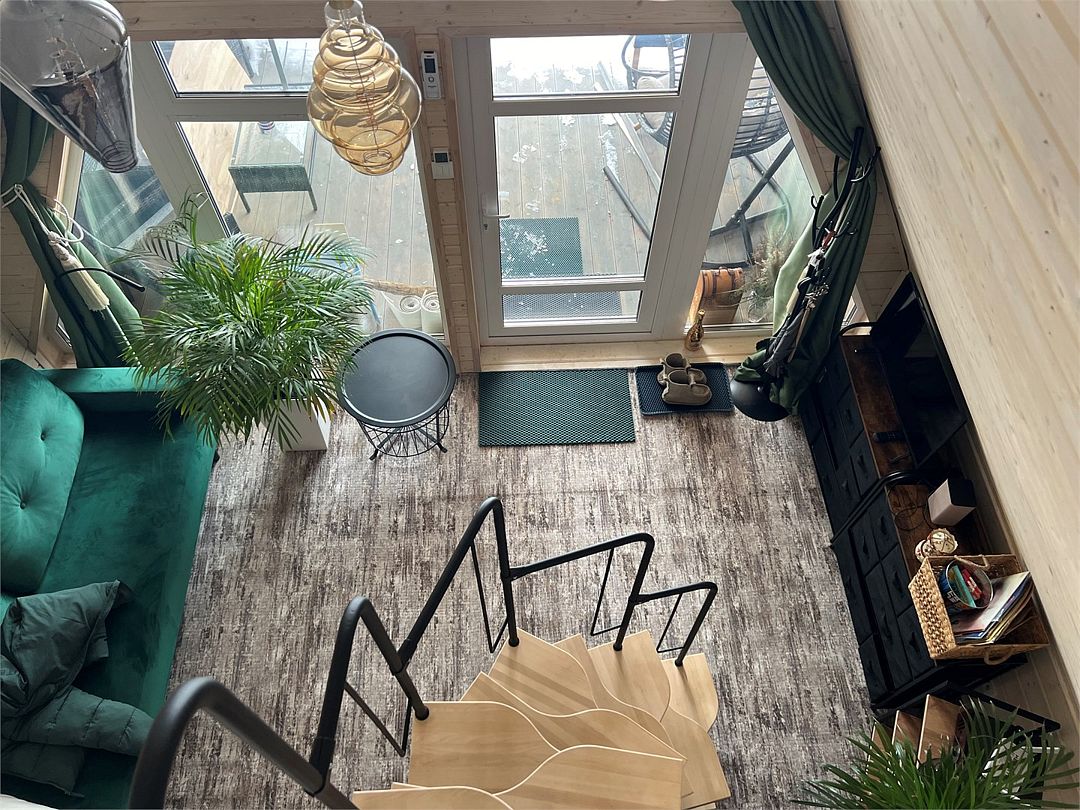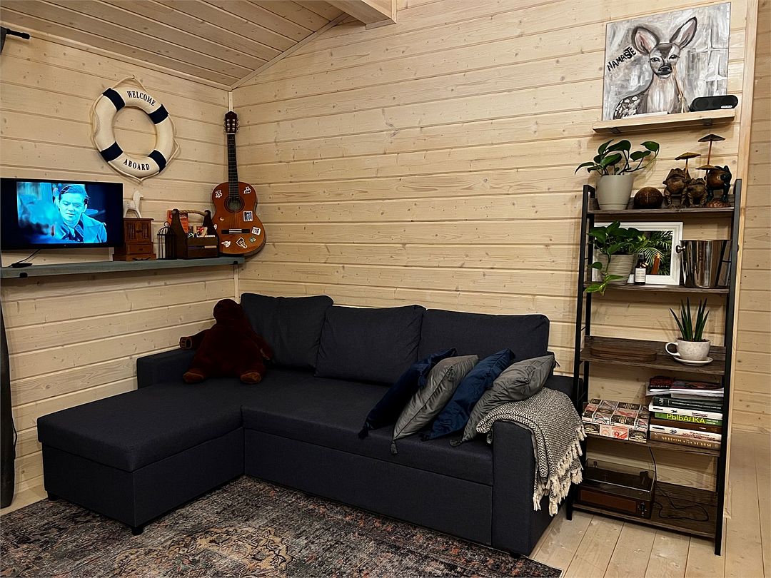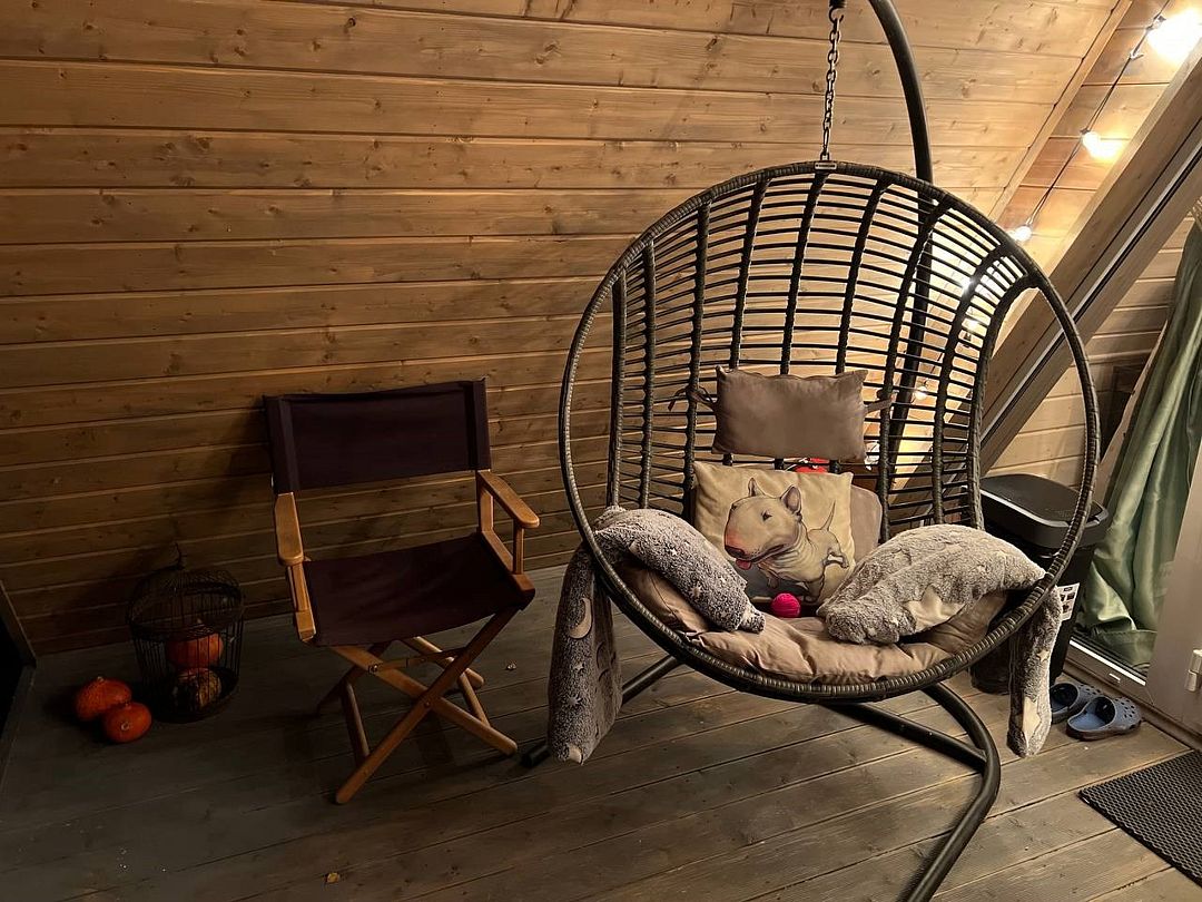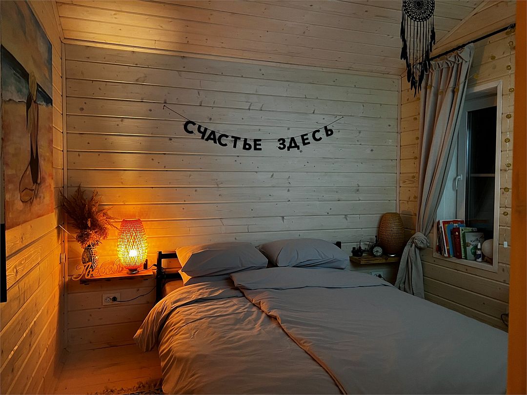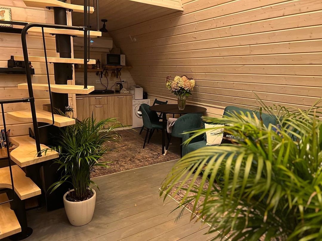 Есть уютная гостиная с удобным диваном, подушками и пледами; спальное место на втором этаже лофта с удобным ортопедическим матрасом.
