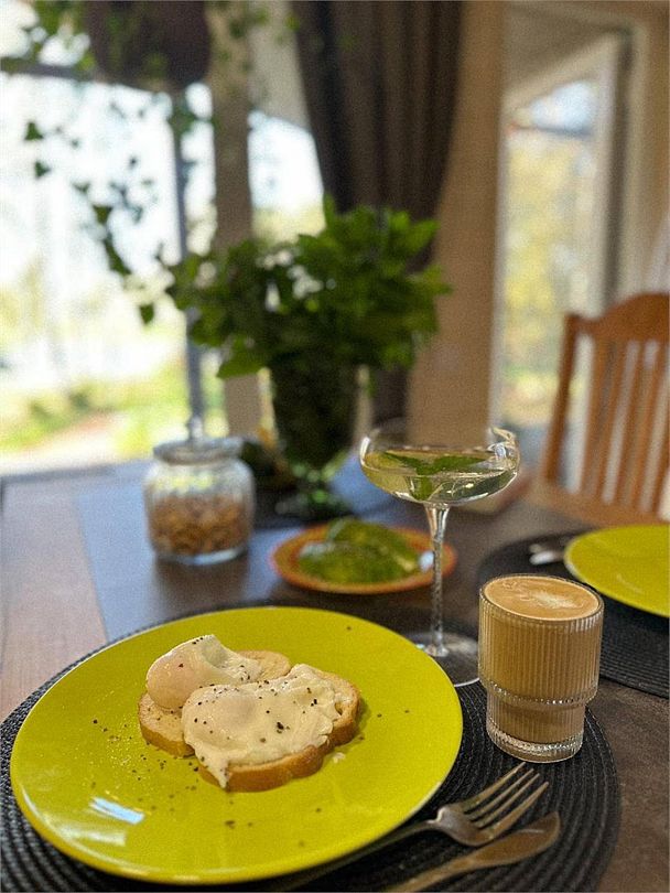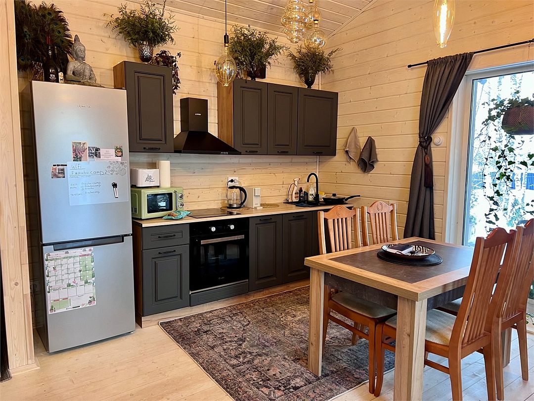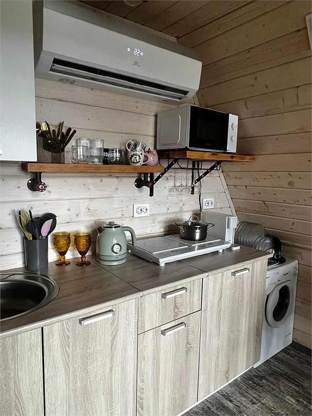 Каждый дом оснащен функциональной кухней, где есть все необходимое: плита, чайник, тостер, кофемашина (капсулы Nespresso), холодильник, стиральная машина, а также вся необходимая посуда, бокалы, специи и даже некоторые продукты.
