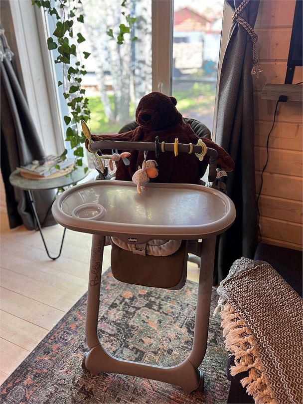Есть кроватка для ребенка, стульчик для кормления и много техники.