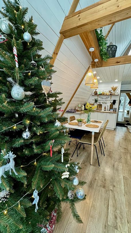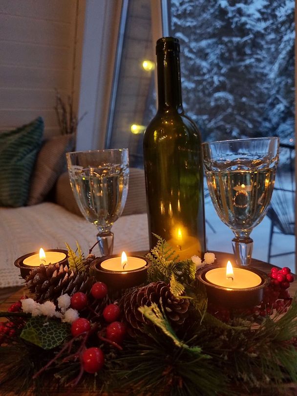 На территории только два домика, между собой огорожены красивым деревянным забором, украшен гирляндой. Вся территория в вашем распоряжении. На террасе подогреваемая круглый год купель и баня бочка с круглым панорамным окном на лес! Для вашего отдыха есть все, с собой только еду и хорошее настроение. Хотя… даже еду не обязательно, можете заказать все из ближайшего ресторана.
