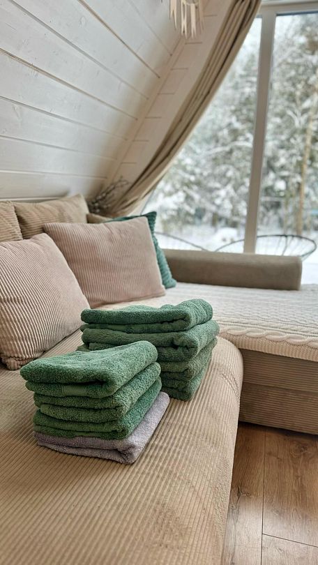 На втором этаже двухспальная кровать с ортопедическим матрасом, на первом этаже раскладной диван с ортопедическим основанием, дополнительно есть возможность предоставить раскладушку (по запросу).