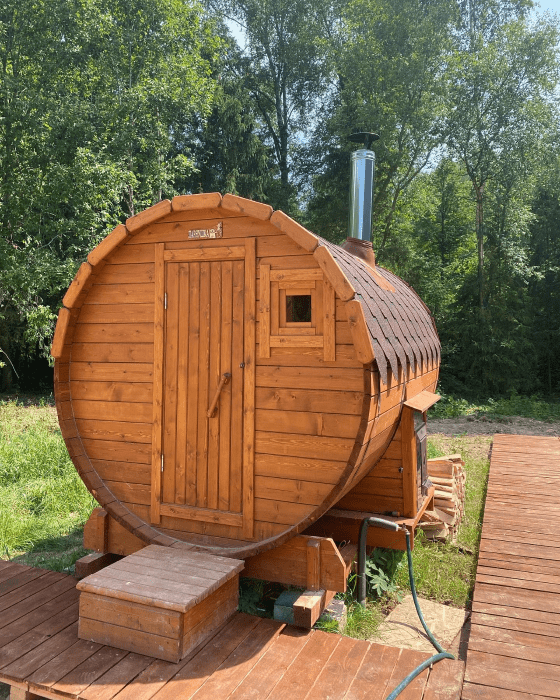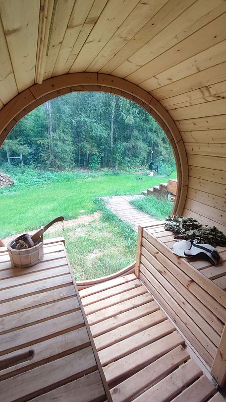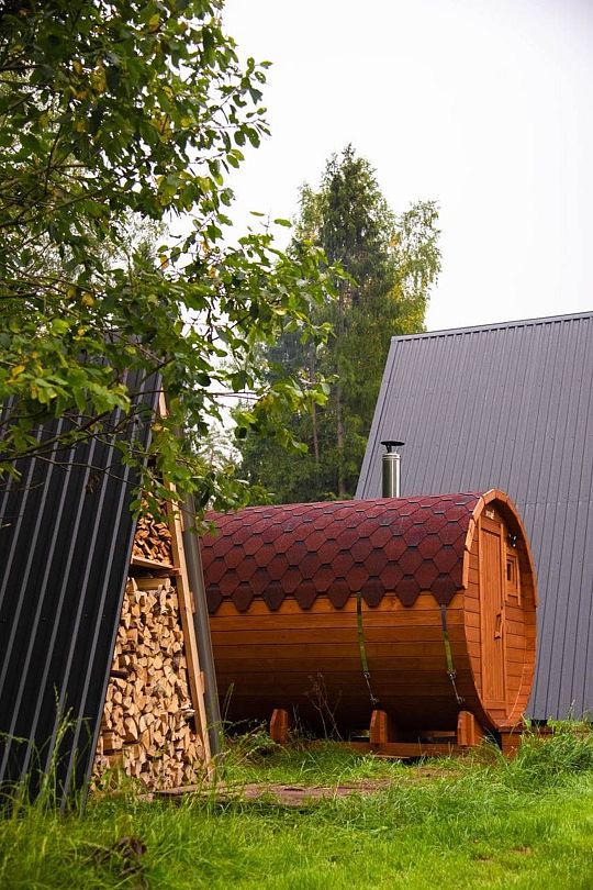 Гости могут погрузиться в атмосферу русской бани, наслаждаясь паром в уникальной бане-бочке с панорамным окном, откуда открывается захватывающий вид на лес. Эта баня на дровах, сохраняющая традиции, работает круглый год и разделена на парную и уютную раздевалку.