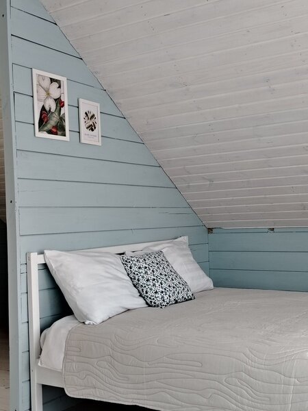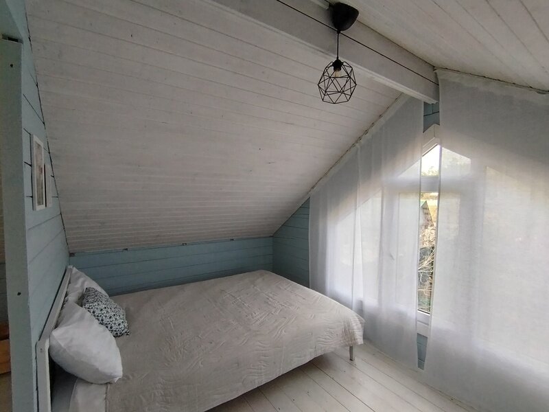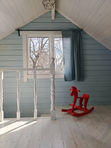 «Голубой домик в Озёрном» — это тёплый двухэтажный дом с просторной верандой и панорамным окном, в котором смогут комфортно разместиться четверо взрослых.