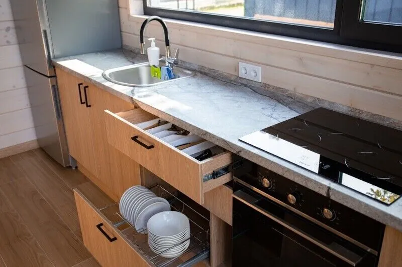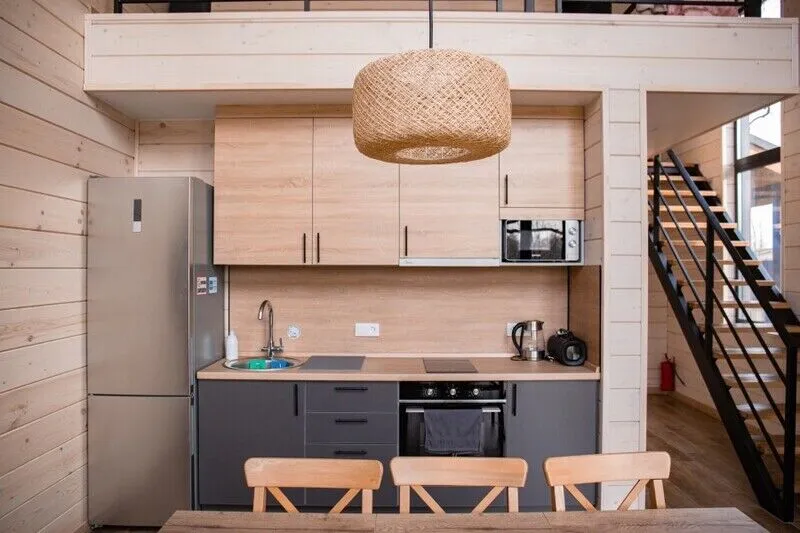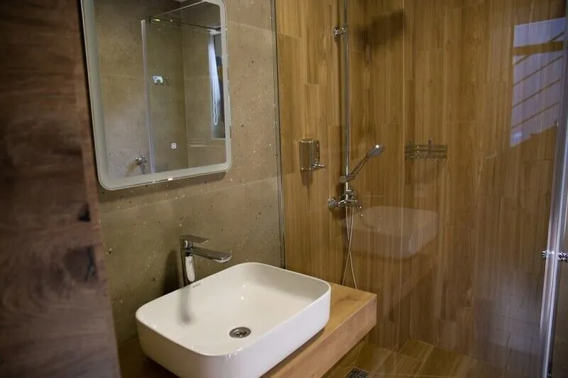 Душевая зона располагает не только удобными душевыми, но и традиционным обливным ведром для завершающего этапа. Комната отдыха с теплым полом и полноценная кухонная зона с плитой, микроволновкой и чайником создают все условия для приятного досуга.