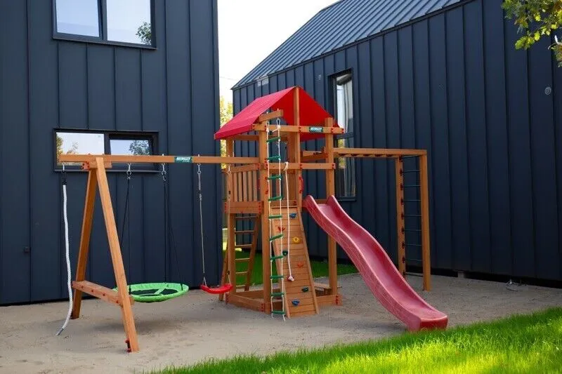 На территории комплекса отдыха для гостей с детьми предусмотрена специально оборудованная детская площадка, где установлены качели, горки и песочница, предоставляющие множество возможностей для активных и увлекательных детских игр.