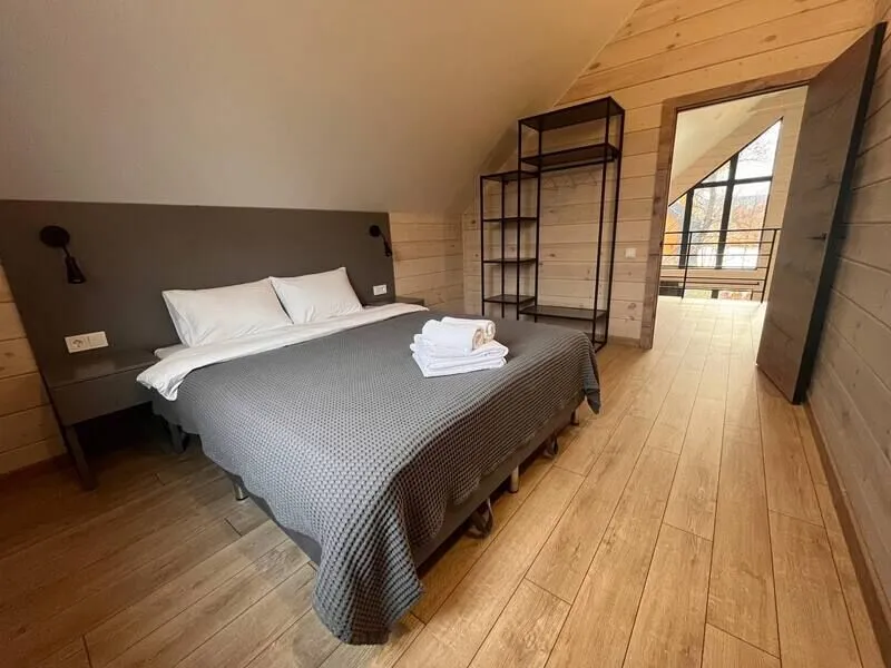Семейный двухэтажный дом с панорамными окнами, видом на озеро и горы. В доме 2 спальных комнаты, 1 санузел, душевая кабина, просторная кухня — гостиная. На кухне есть вся необходимая посуда и техника.
