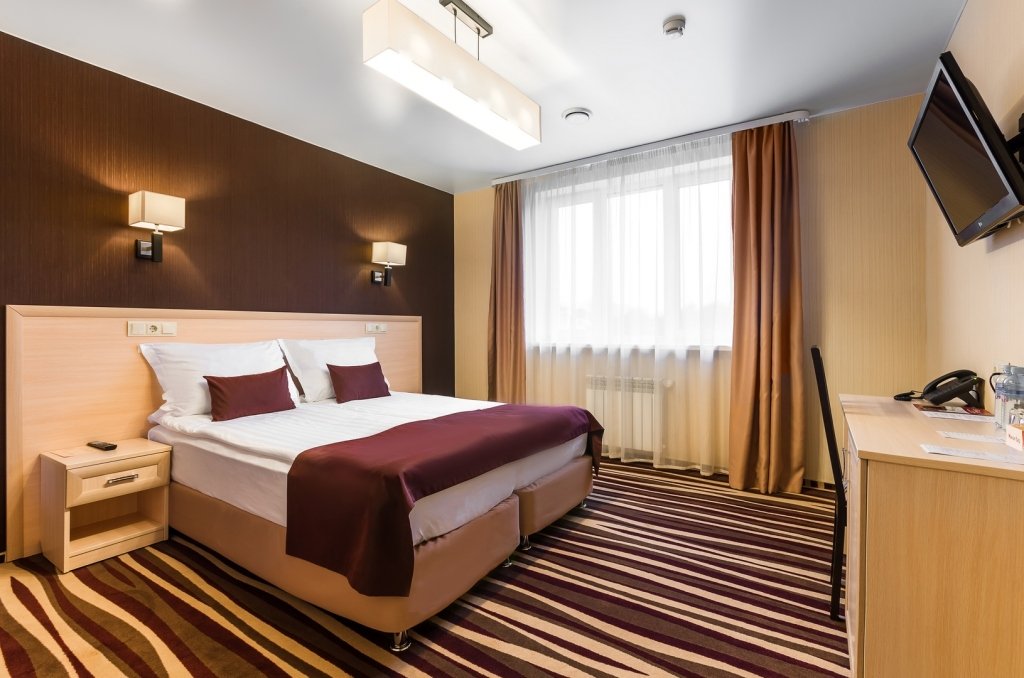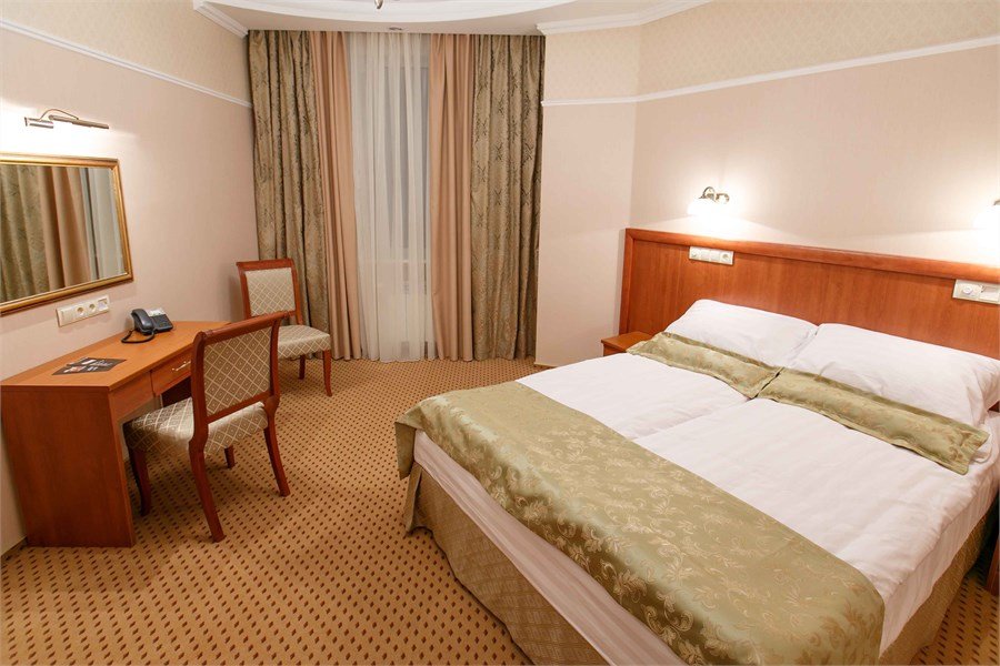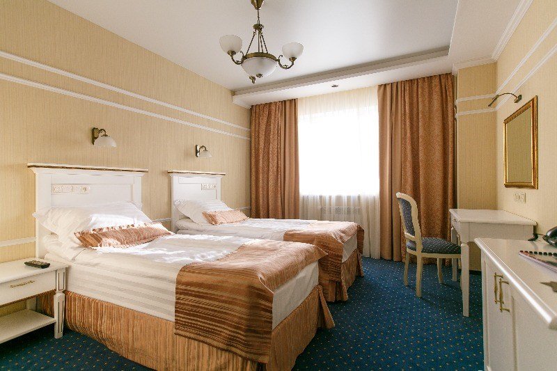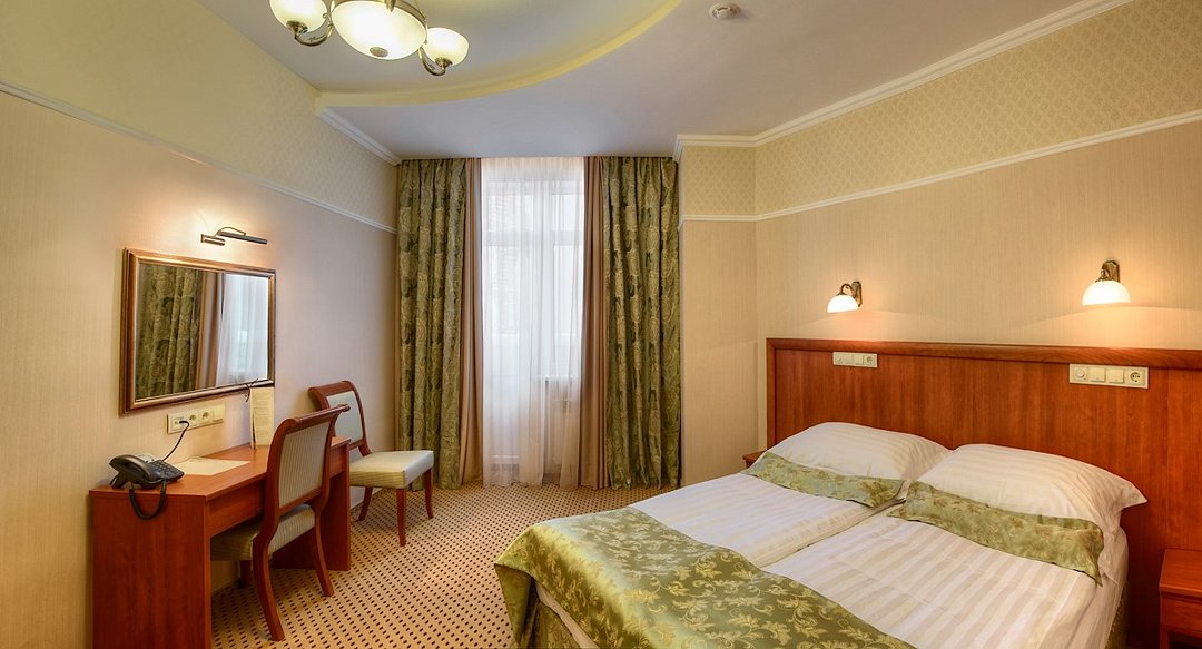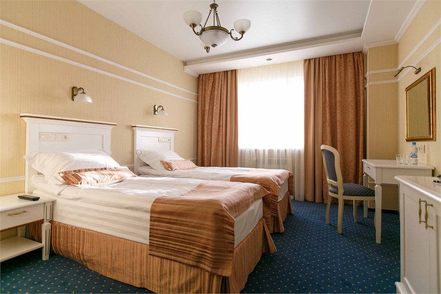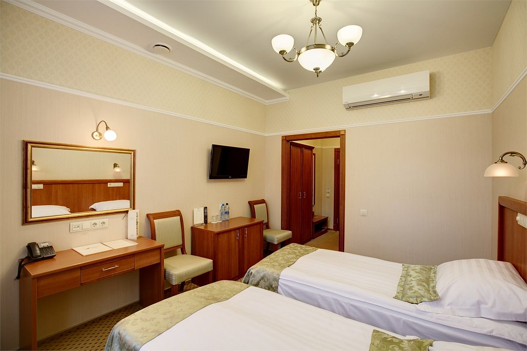 Номер средней площадью 21 кв.м. В номере есть балкон. Элегантный классический интерьер. В номере: две раздельные кровати с ортопедическим матрацами, рабочий стол, сейф, телевизор с плоским экраном, шкаф для одежды, багажница. Номер оборудован индивидуальной сплит-системой и системой black-out . В ванной комнате: раковина и душевой поддон выполнены из искусственного камня, дизайнерская плитка с мозаикой, современная душевая система. Бутилированная вода – в подарок при заезде.Услуги и удобства