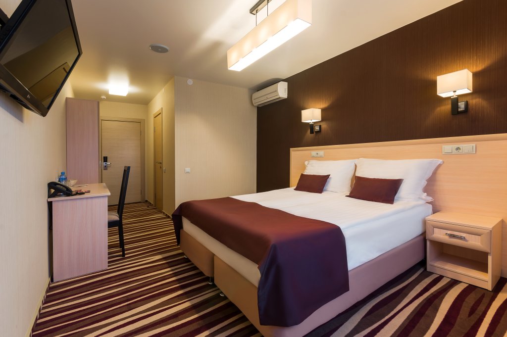 Стандартный одноместный номер средней площадью 17 кв.м. В номере есть балкон. Элегантный классический интерьер. В номере: удобная кровать с ортопедическим матрацем шириной от 90 до 120 см, рабочий стол, сейф, телевизор с плоским экраном, шкаф для одежды, багажница. Номер оборудован индивидуальной сплит-системой и системой black-out. В ванной комнате: раковина и душевой поддон выполнены из искусственного камня, дизайнерская плитка с мозаикой, современная душевая система. Бутилированная вода – в подарок при заезде.Услуги и удобства