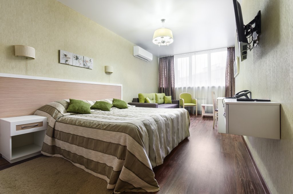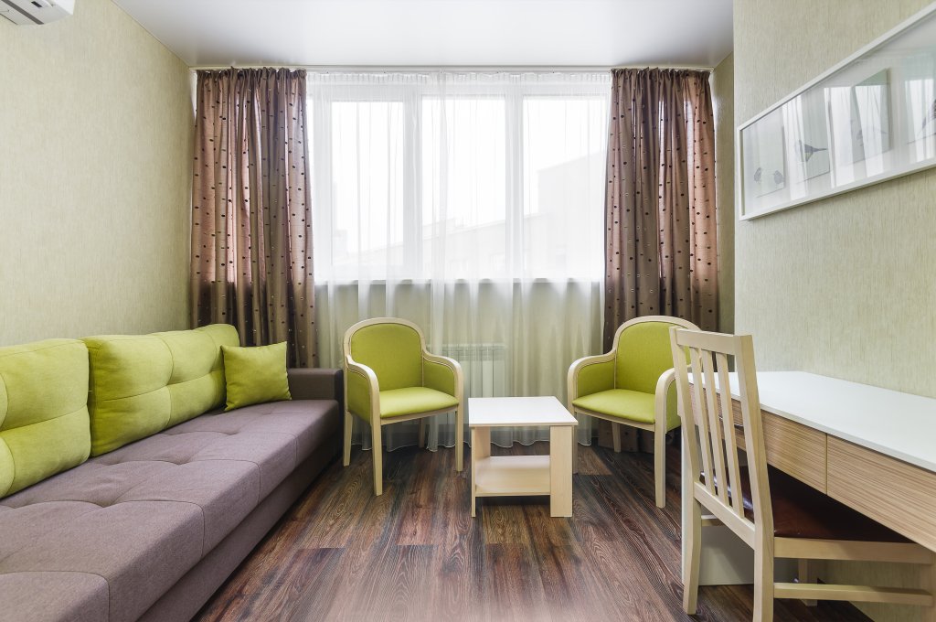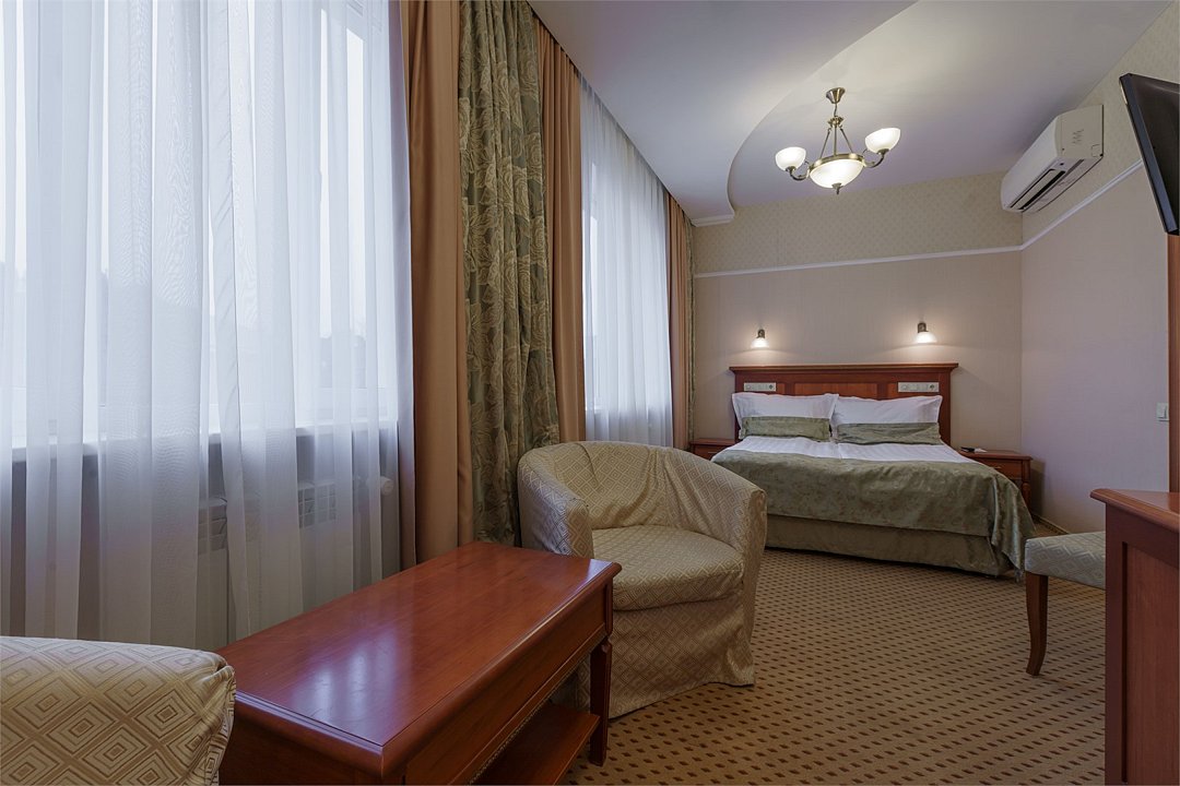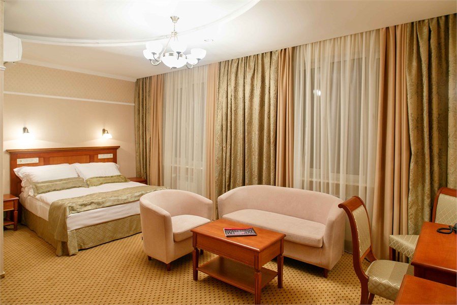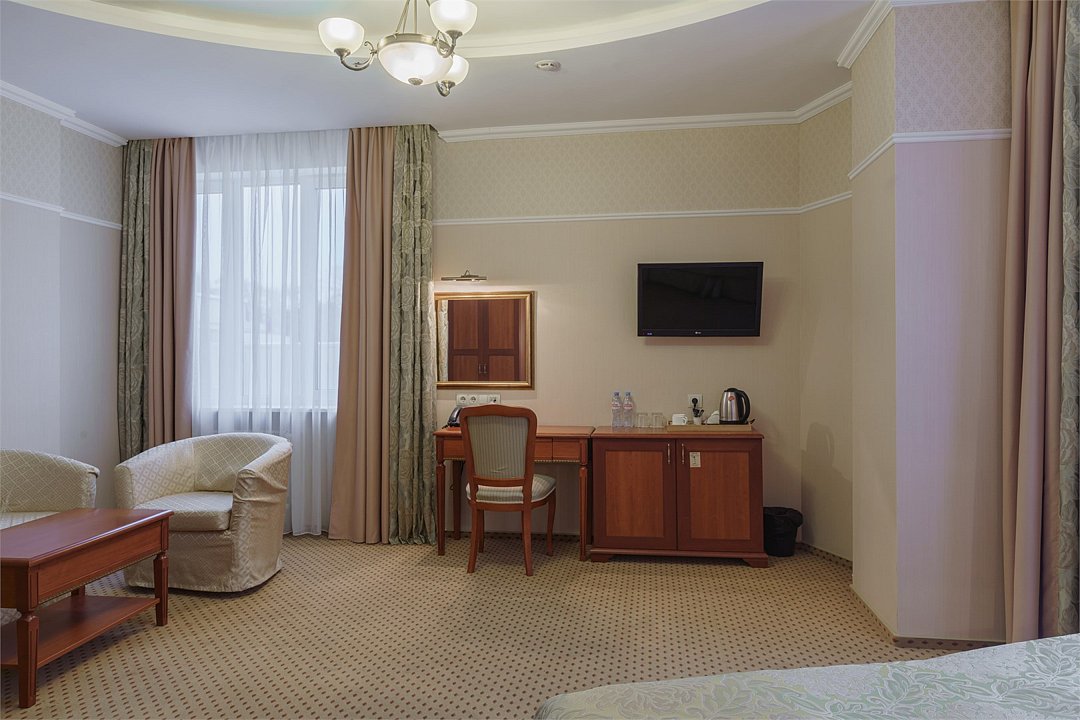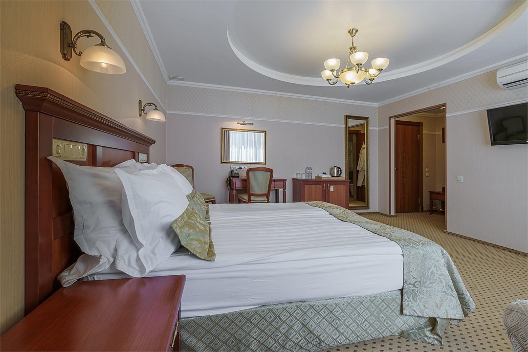 Однокомнатный номер повышенной комфортности с функциональным разделением на спальную и гостевую зону. Общая площадь номера составляет более 30 кв. метров. Элегантный классический интерьер. В номере: кровать Queen size с ортопедическим матрацем, рабочий стол, мини-бар, сейф, телевизор с плоским экраном, набор мягкой мебели, кофейный столик, шкаф для одежды, багажница. Номер оборудован индивидуальной сплит-системой и системой black-out . В ванной комнате: раковина и душевой поддон выполнены из искусственного камня, дизайнерская плитка с мозаикой, современная душевая система. Бутилированная вода – в подарок при заезде.Услуги и удобства