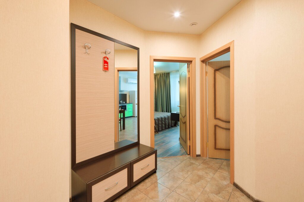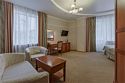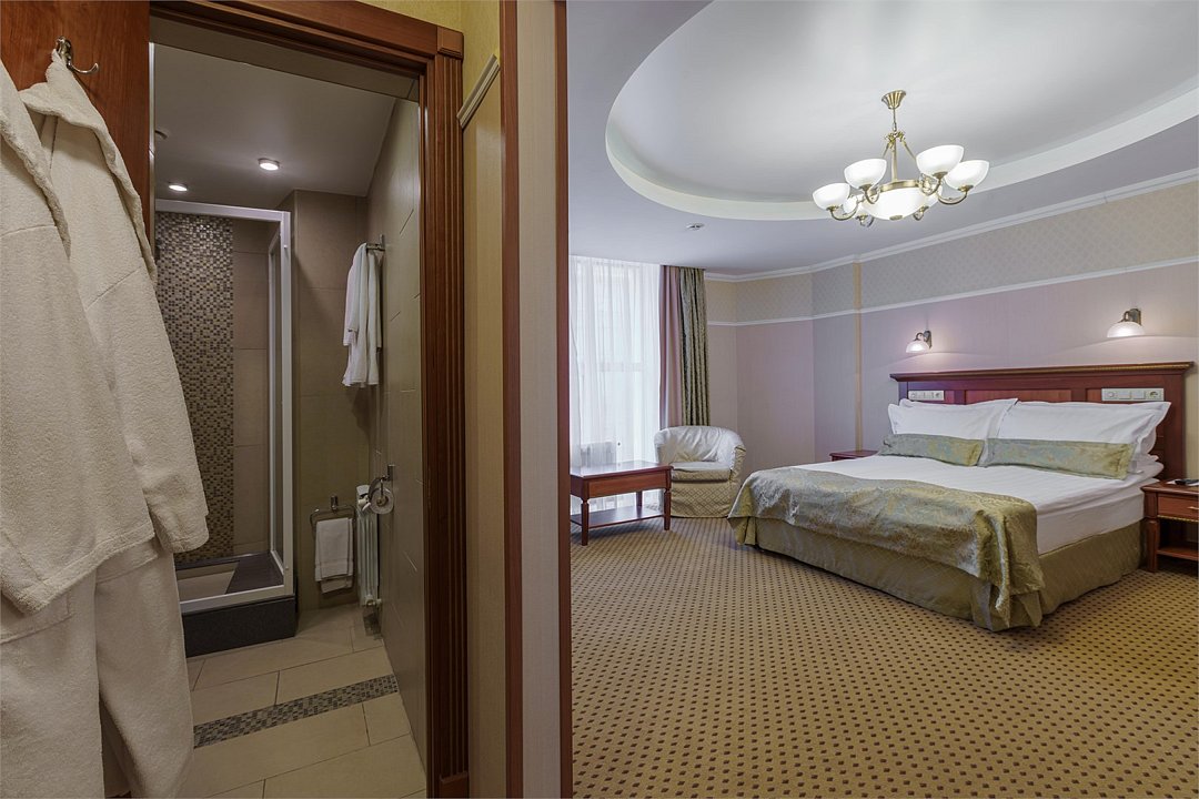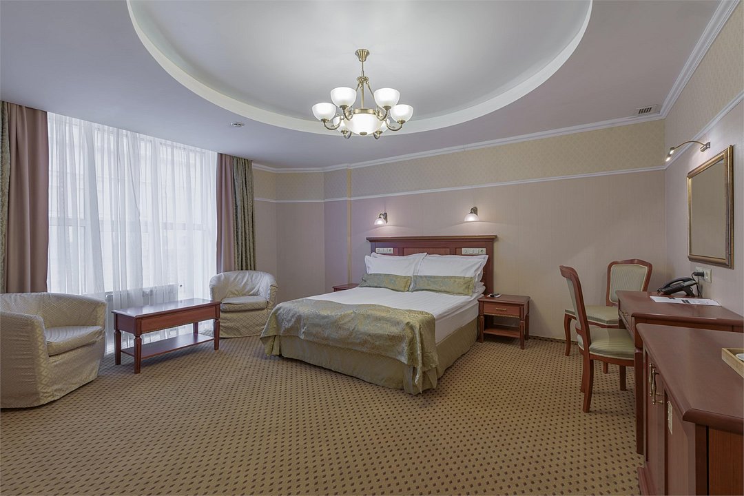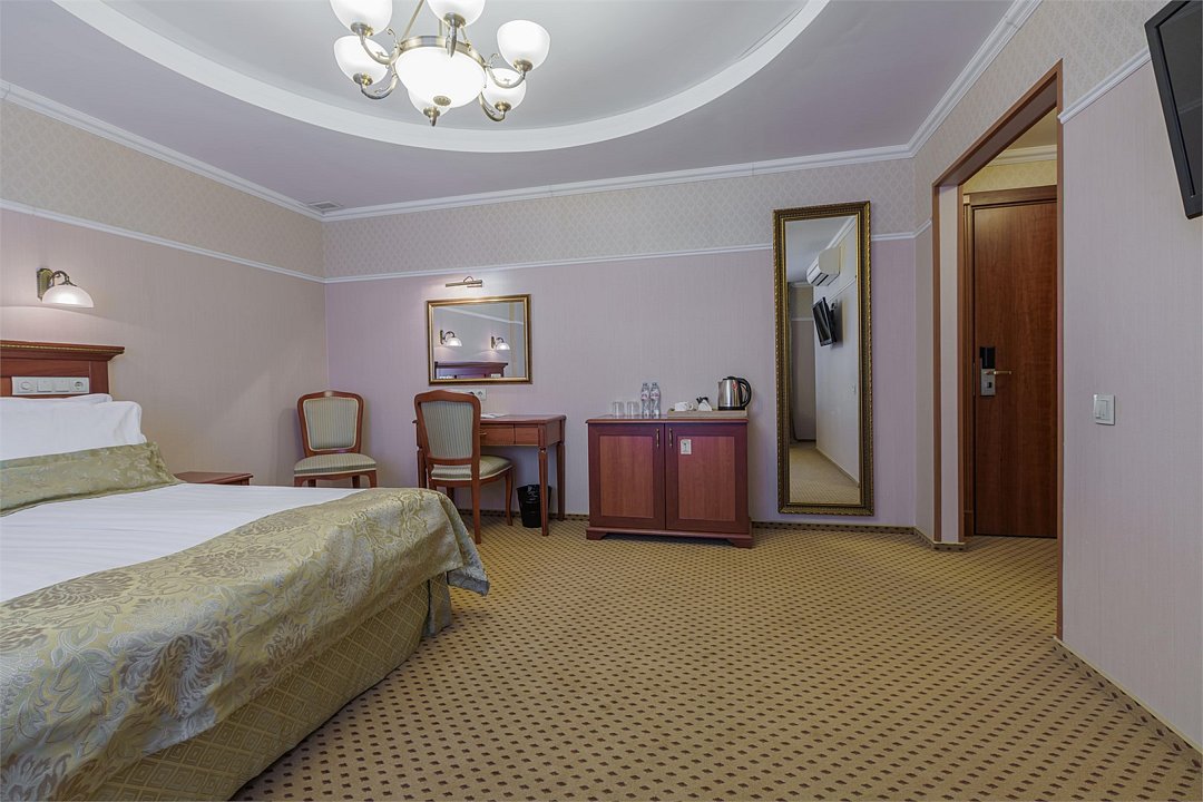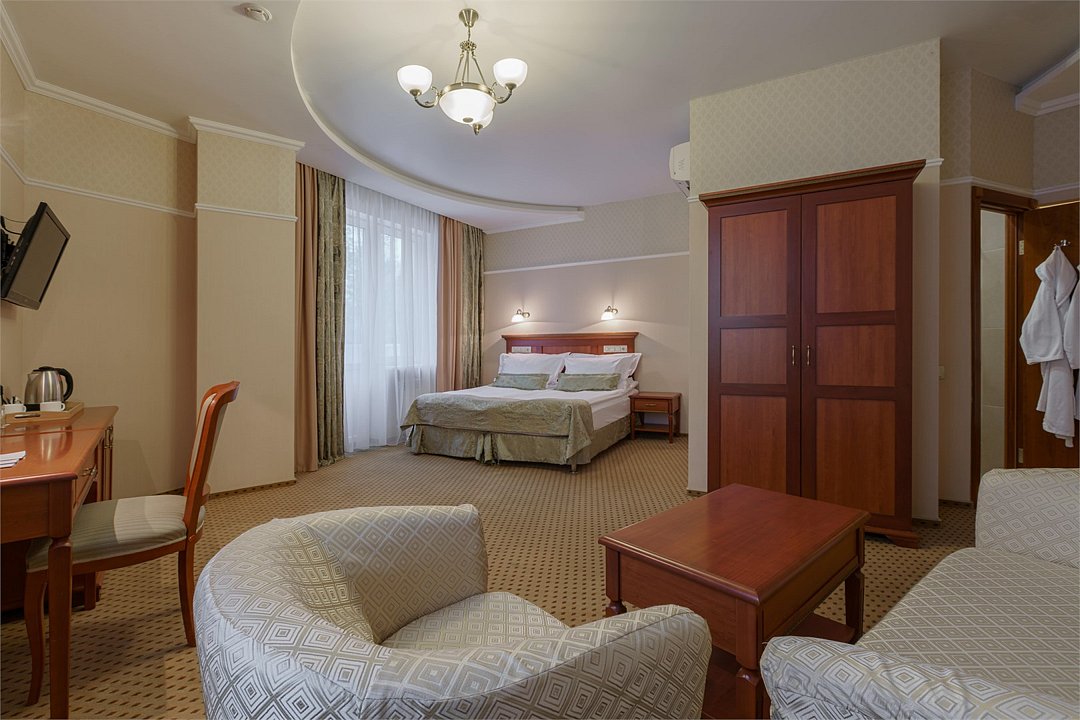 Однокомнатный номер повышенной комфортности с функциональным разделением на спальную и гостевую зону. Общая площадь номера составляет более 30 кв. метров. В номере есть балкон. Элегантный классический интерьер. В номере: кровать Queen size с ортопедическим матрацем, рабочий стол, мини-бар, сейф, телевизор с плоским экраном, набор мягкой мебели, кофейный столик, шкаф для одежды, багажница. Номер оборудован индивидуальной сплит-системой и системой black-out . В ванной комнате: раковина и душевой поддон выполнены из искусственного камня, дизайнерская плитка с мозаикой, современная душевая система. Бутилированная вода – в подарок при заезде.Услуги и удобства