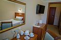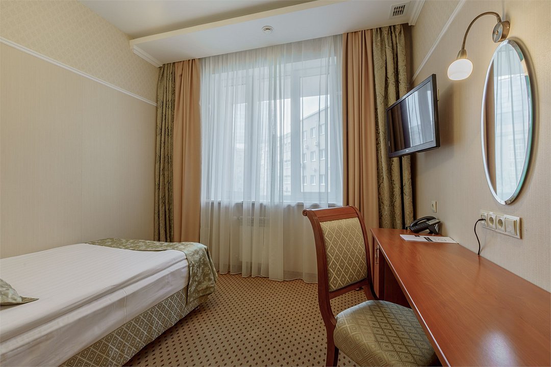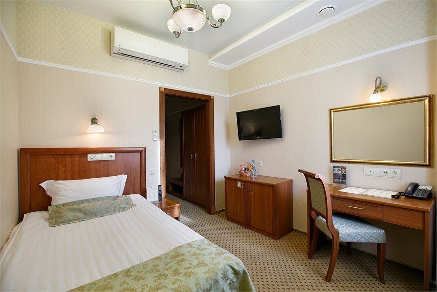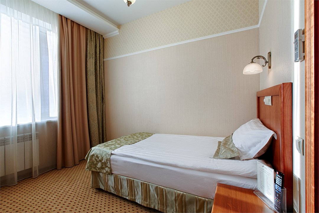 Стандартный одноместный номер средней площадью 17 кв.м. Элегантный классический интерьер. В номере: удобная кровать с ортопедическим матрацем шириной от 90 до 120 см, рабочий стол, сейф, телевизор с плоским экраном, шкаф для одежды, багажница. Номер оборудован индивидуальной сплит-системой и системой black-out. В ванной комнате: раковина и душевой поддон выполнены из искусственного камня, дизайнерская плитка с мозаикой, современная душевая система. Бутилированная вода – в подарок при заезде.Услуги и удобства