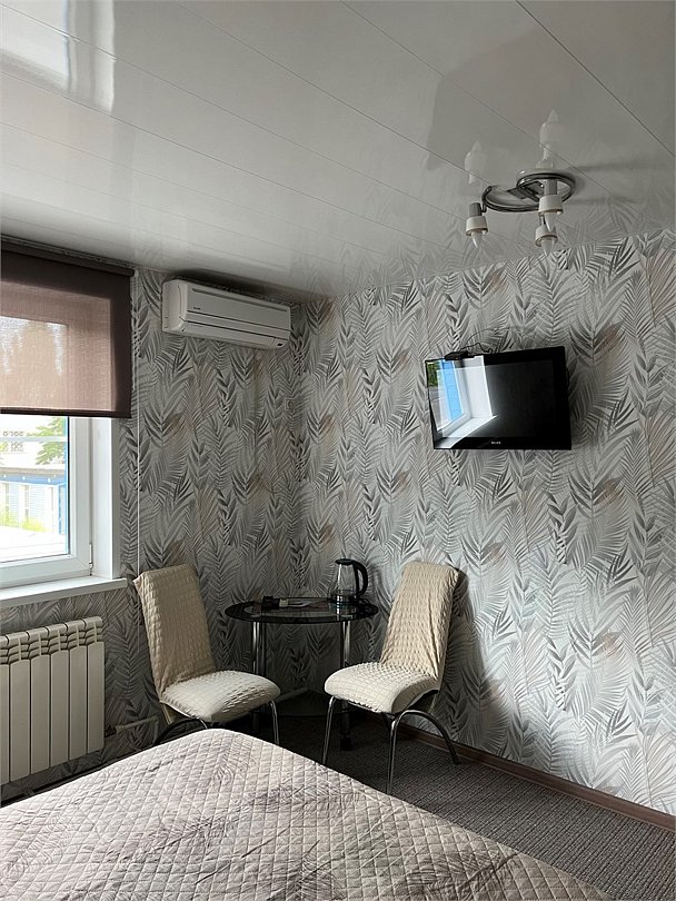 телевизор, спутниковое телевидение, кабельное телевидение, Wi-Fi, интернет, кондиционер, светильник, настольные лампы, фен, утюг, радио, обогреватель, душевая кабина, водонагреватель, банные принадлежности, банные полотенца, тапочки, двуспальная кровать, полутораспальная кровать, тумбы, стулья, шкаф для одежды, вешалки, журнальный столик, зеркало, унитаз, раковина, кулер на этаже, вид во двор, туалет, сплит-система, цифровое тв, телевизор с плоским экраном, мыло, Android TVВ номере