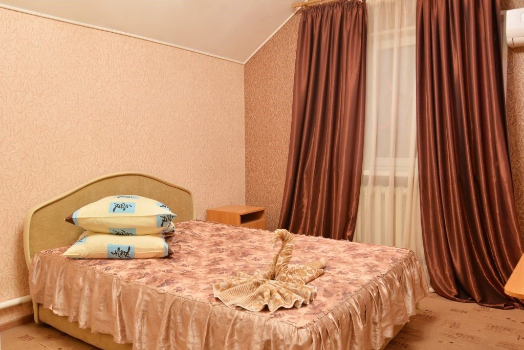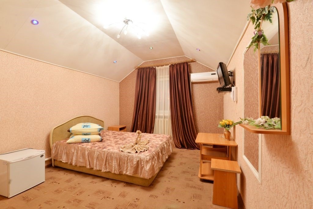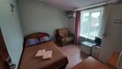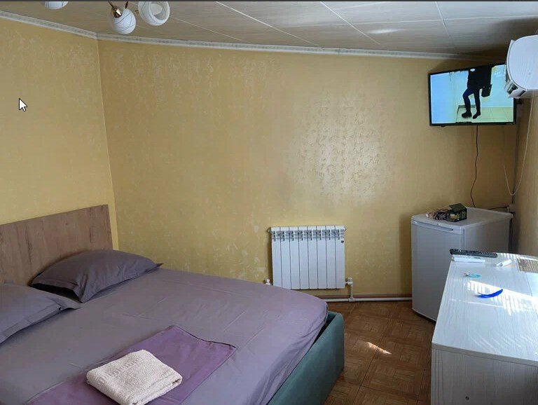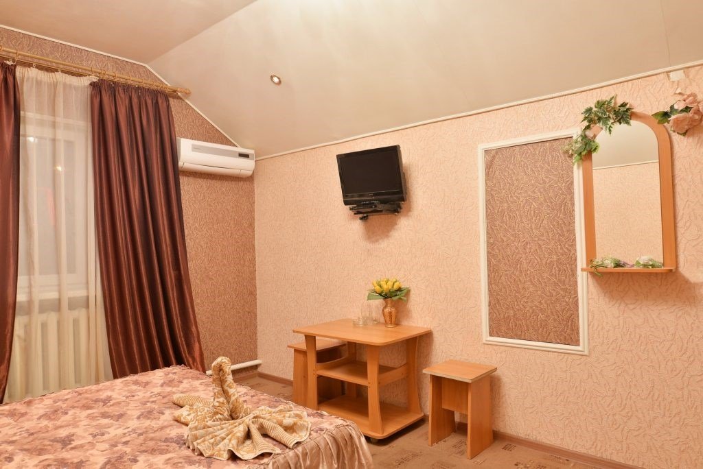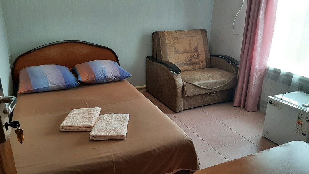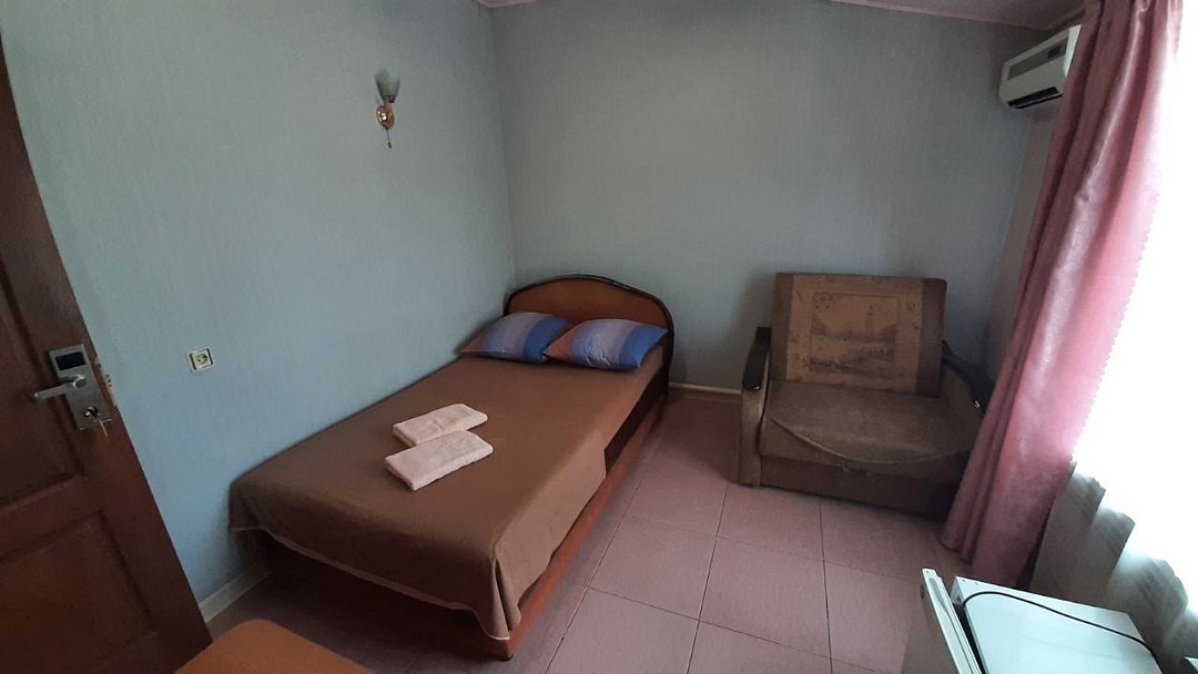 кабельное телевидение, Wi-Fi, двуспальная кровать, диван, тумбы, шкаф для одежды, журнальный столик, душ, плиточное покрытие, вид во двор, стаканы, туалет, сплит-система, мини-холодильникВ номере