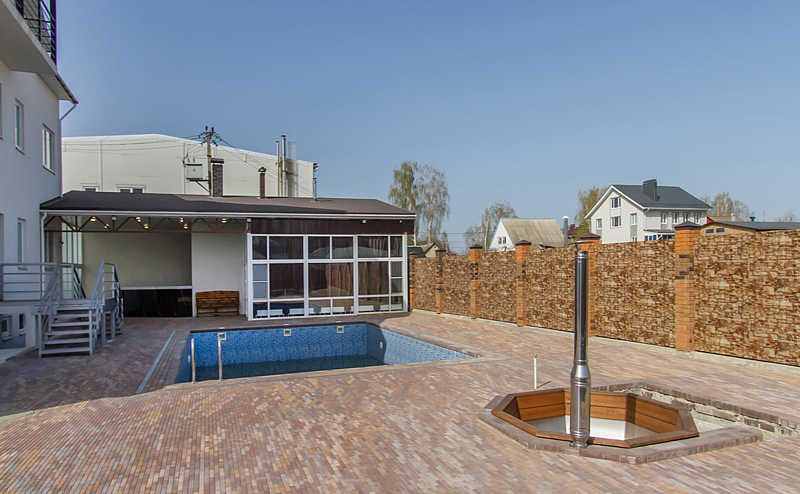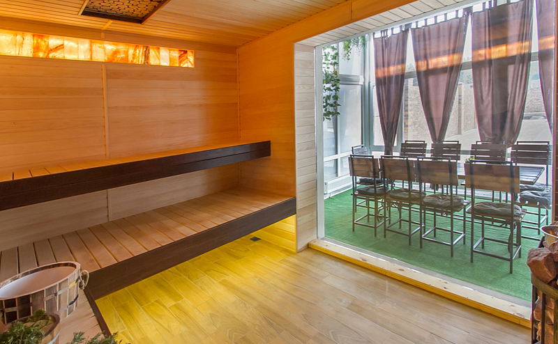 Баня с панорамным видом. Из парной открывается шикарный вид на бассейн, что добавляет особую атмосферу релакса. Приятно наслаждаться паром, наблюдая за спокойной гладью воды и отдыхом других гостей. Парная идеально прогревается, чистая и с приятным ароматом дерева, что создает ощущение настоящей банной церемонии.