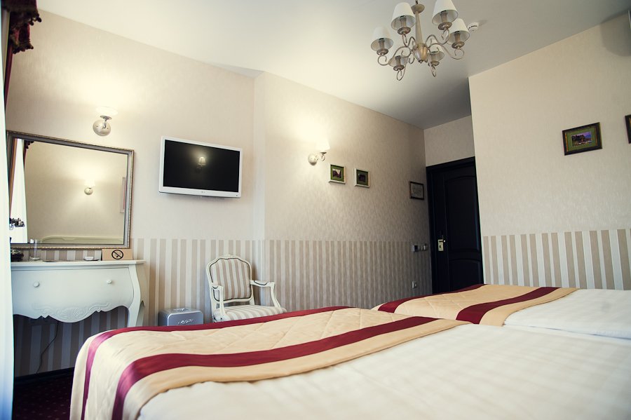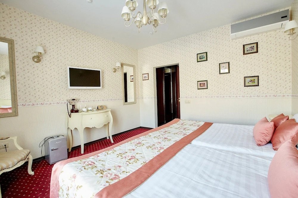 телевизор, Wi-Fi, телефон, холодильник, кондиционер, светильник, фен, электронные замки, душевая кабина, санузел, водонагреватель, банные принадлежности, халаты, банные полотенца, тапочки, гигиенические средства, две односпальные или большая двуспальная кровать, ортопедический матрас, тумбы, стулья, шкаф для одежды, вешалки, журнальный столик, зеркало, эксклюзивная мебель, мини-бар, информационная карта, меню, минеральная вода, можно с питомцамиВ номере